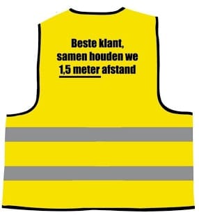 Medewerkers van de DekaMarkt krijgen deze week knalgele hesjes met daarop de oproep om anderhalve meter afstand te houden. De supermarkt roept klanten dringend op de anderhalve meter-regel strikt te respecteren, voor de veiligheid van het personeel en de klanten. Op de hesjes staat: ‘Beste klant, samen houden we 1,5 meter afstand’.