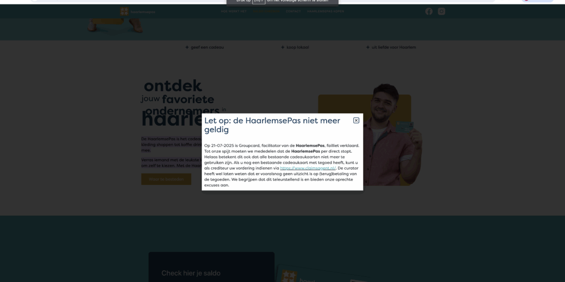 Het faillissement van Groupcard, het bedrijf achter verschillende lokale cadeaukaarten, raakt ook Haarlem. Groupcard was verantwoordelijk voor de uitgifte van de HaarlemsePas – een cadeaukaart die te besteden was bij lokale ondernemers en via het middenstandsplatform HaarlemseWinkels.nl. Het bedrijf was ook aandeelhouder van die website.