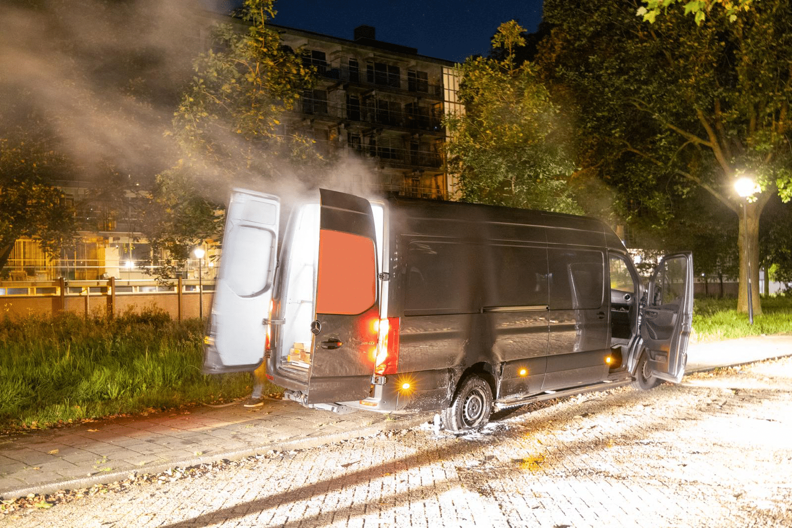 Aanmaakblokjes gevonden naast brandende werkbus, politie vermoedt brandstichting