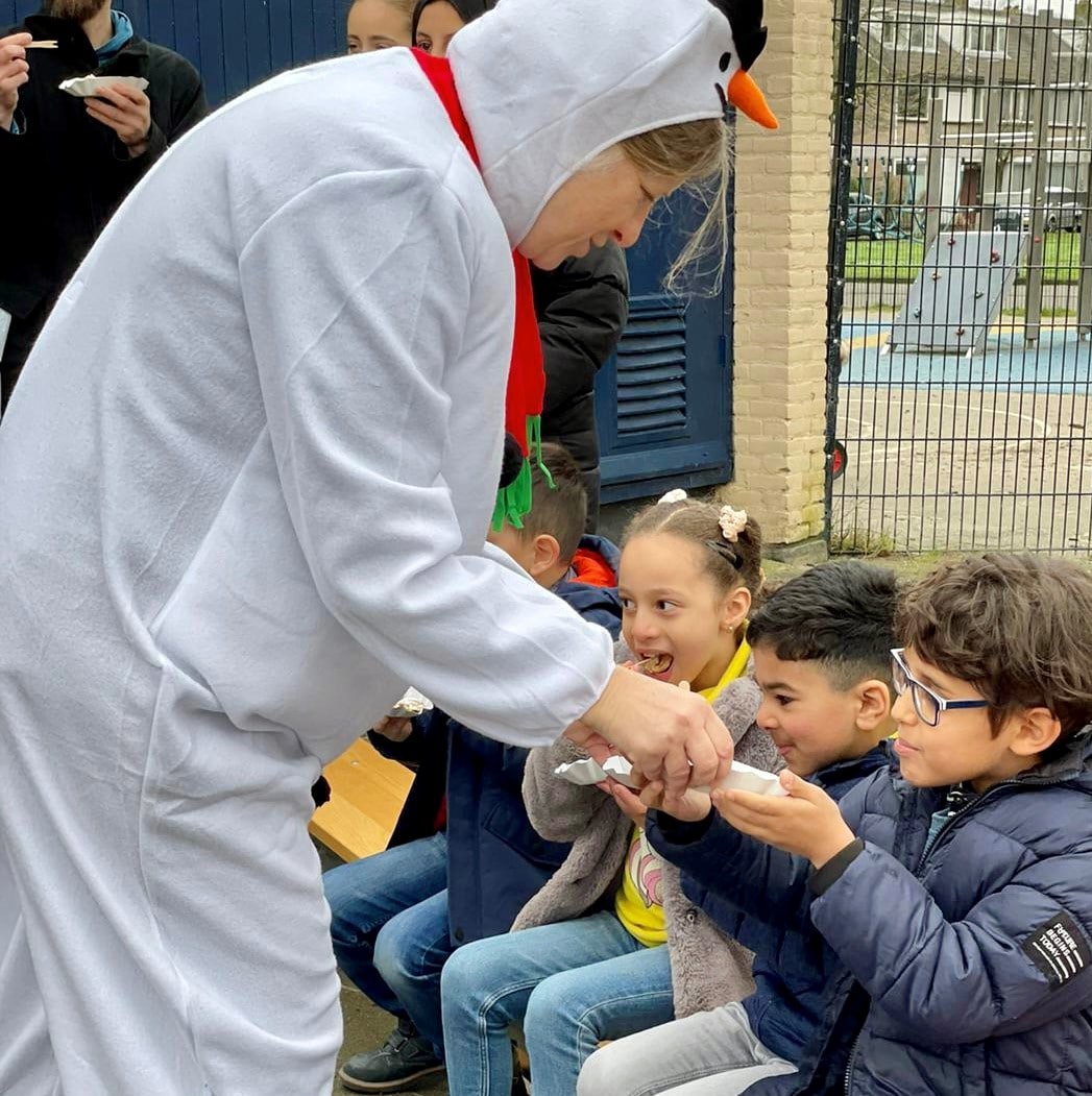 Per klas konden de leerlingen zich vanochtend laven aan de oer-Hollandse lekkernij – het poffertje – met een warme kop chocolademelk. En met muziek op de achtergrond zorgde de ‘levende’ sneeuwpop voor het nodigde vertier.