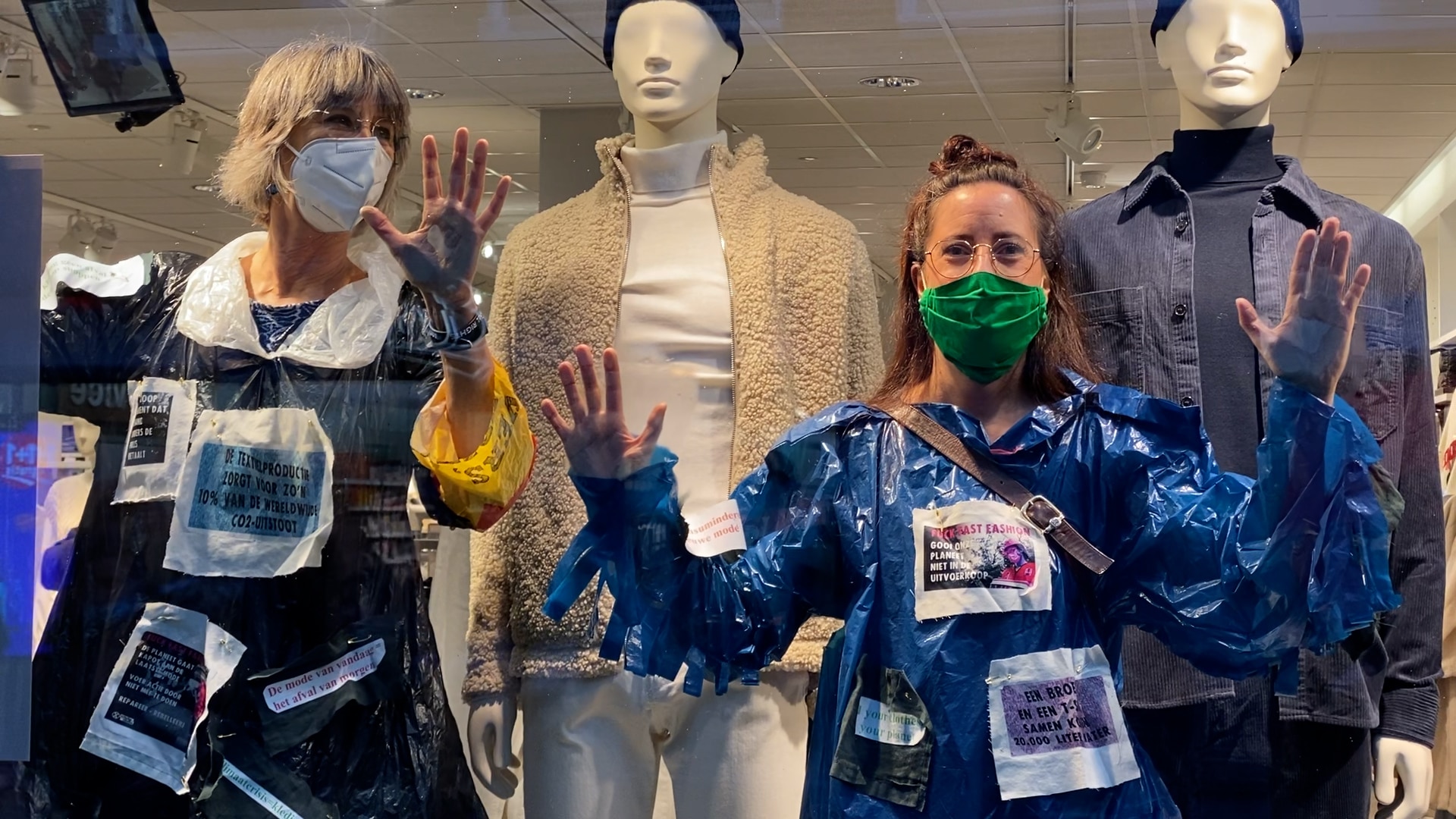 De etalage van een grote kledingwinkelketen aan de Grote Houtstraat was vanmiddag het decor van een actie van Extinction Rebellion. Gehuld in vuilniszakken lijmden drie actievoerders hun handen aan de binnenkant van de etalageruit vast om aandacht te vragen voor de kledingindustrie, die volgens de organisatie zeer vervuilend is voor het milieu.
