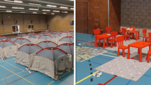 De veldbedden die in eerste instantie in rijen opgesteld stonden in de oude sporthal, zijn nu vervangen door tenten, vertelt Machiel Pouw. Een klein team van professionals samen met een tiental vrijwilligers van het Rode Kruis doet er alles aan om de noodopvang zo ‘huiselijk’ mogelijk te maken, vooral voor de gezinnen die er onderdak vinden. Er is met nieuw kindermeubilair een hoekje voor de jonge vluchtelingen ingericht en er zijn veel kleurpotloden, lego en andere speelgoed aangeleverd.