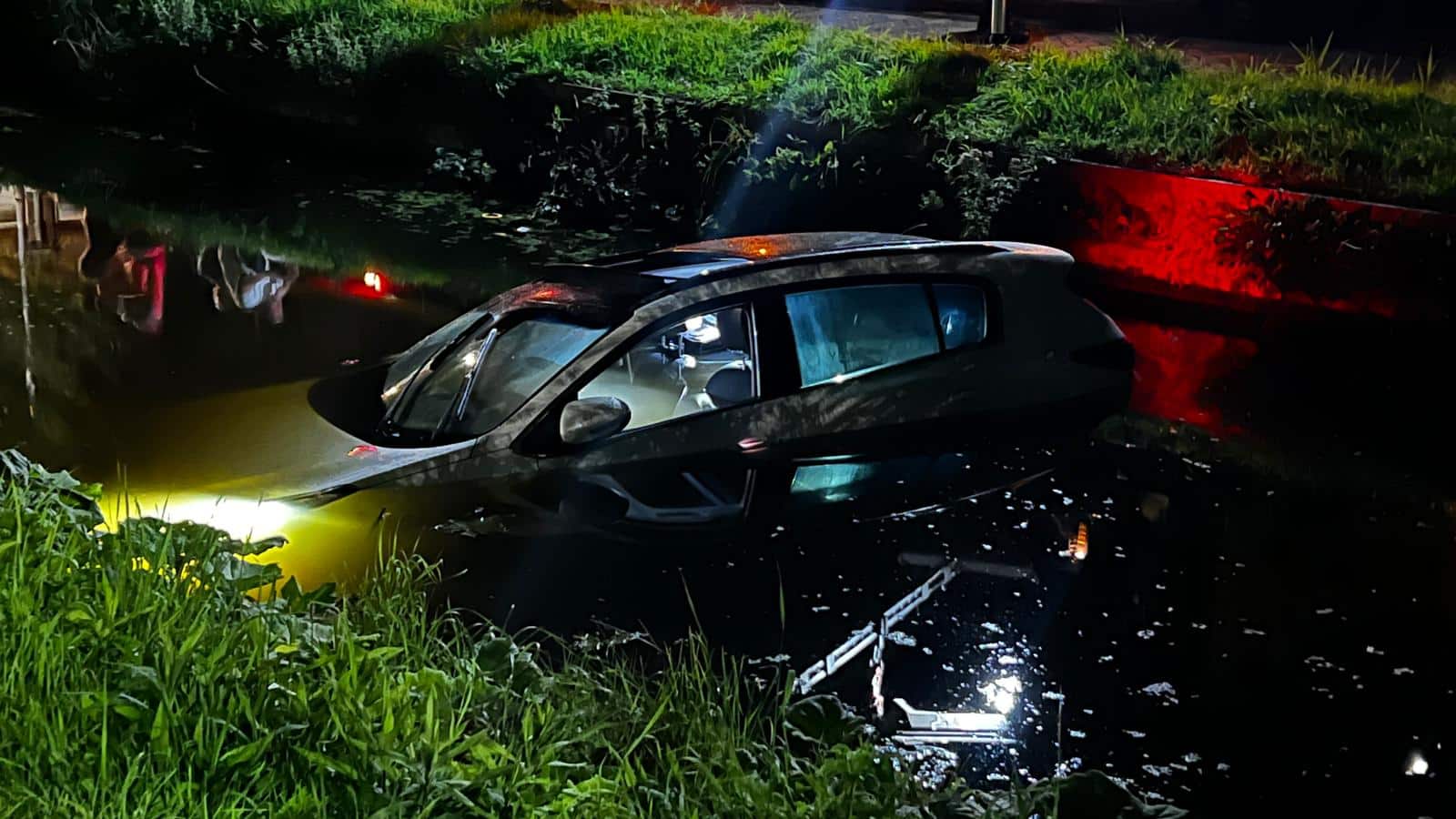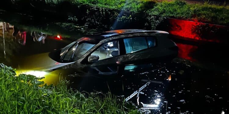 Een auto is gisteravond het water in gereden langs de Garenkokerskade in Haarlem. De auto stond geparkeerd voor een garagebox maar niet op de handrem. Langzaam rolde het voertuig de sloot in.