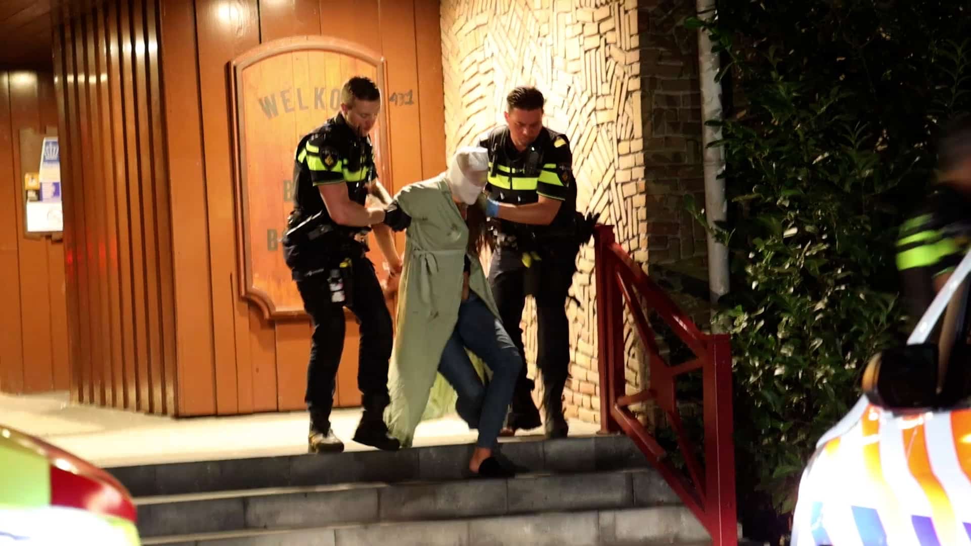 Het was nog een hele klus om de vrouw in de boeien te slaan. Ze weigerde mee te werken en heeft uiteindelijk een kalmeringsmiddel gekregen en moest een spuugmasker op voordat ze het politiebusje in kon.