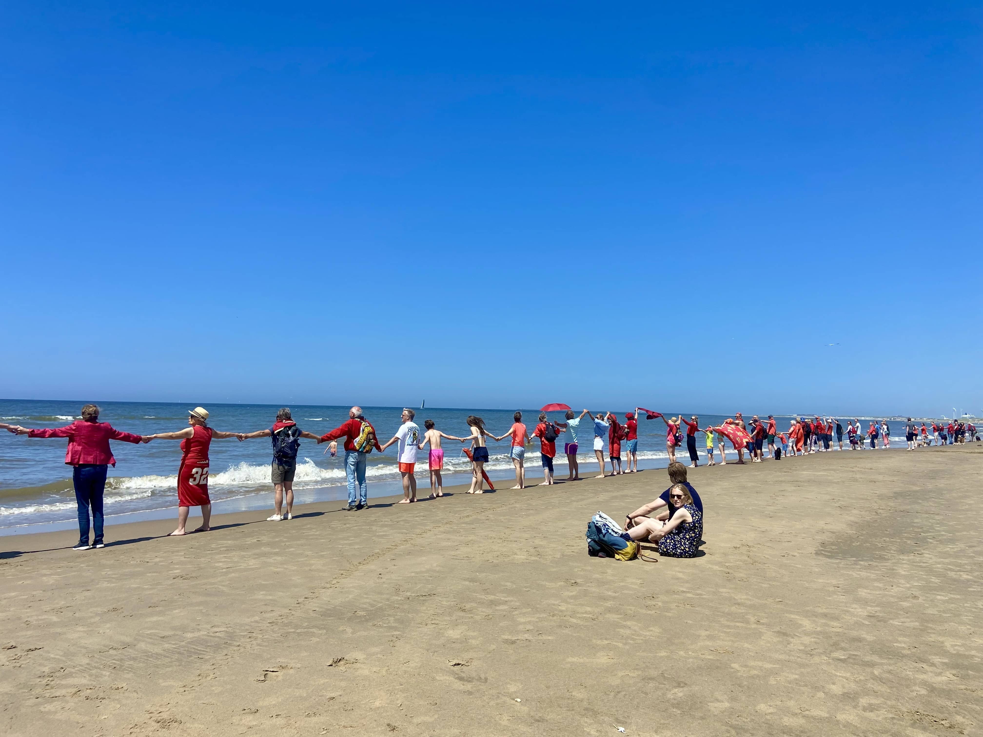 Het strand van Bloemendaal was een van de plekken waar vandaag deelgenomen kon worden aan een klimaatdemonstratie van de Climate Chain. Door de hogere temperaturen was het strand ook gevuld met dagjesmensen die verbaasd opkeken van alle rode kleding op het strand.