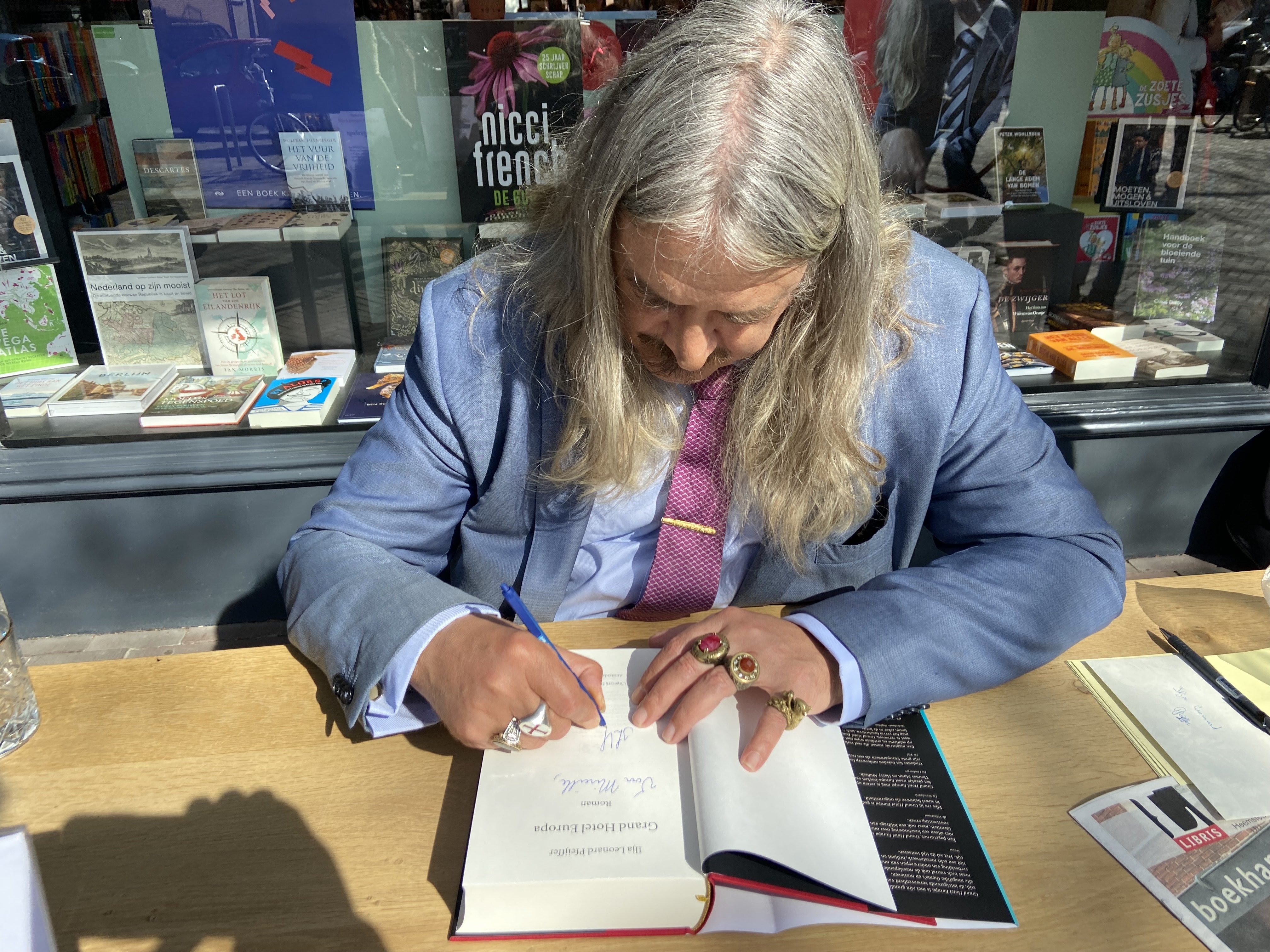In Heemstede op de Binnenweg signeerde Ilja Leonard Pfeijffer bij Boekhandel Blokker. Op de stoep voor de winkel staan lezers in een lange rij met hun zojuist gekochte boeken van de schrijver. Pfeijffer woont al jaren in het Italiaanse Genua maar hij reist regelmatig naar Nederland voor zijn werk. Zeker in de boekenweek.