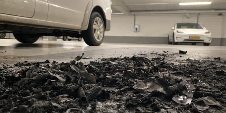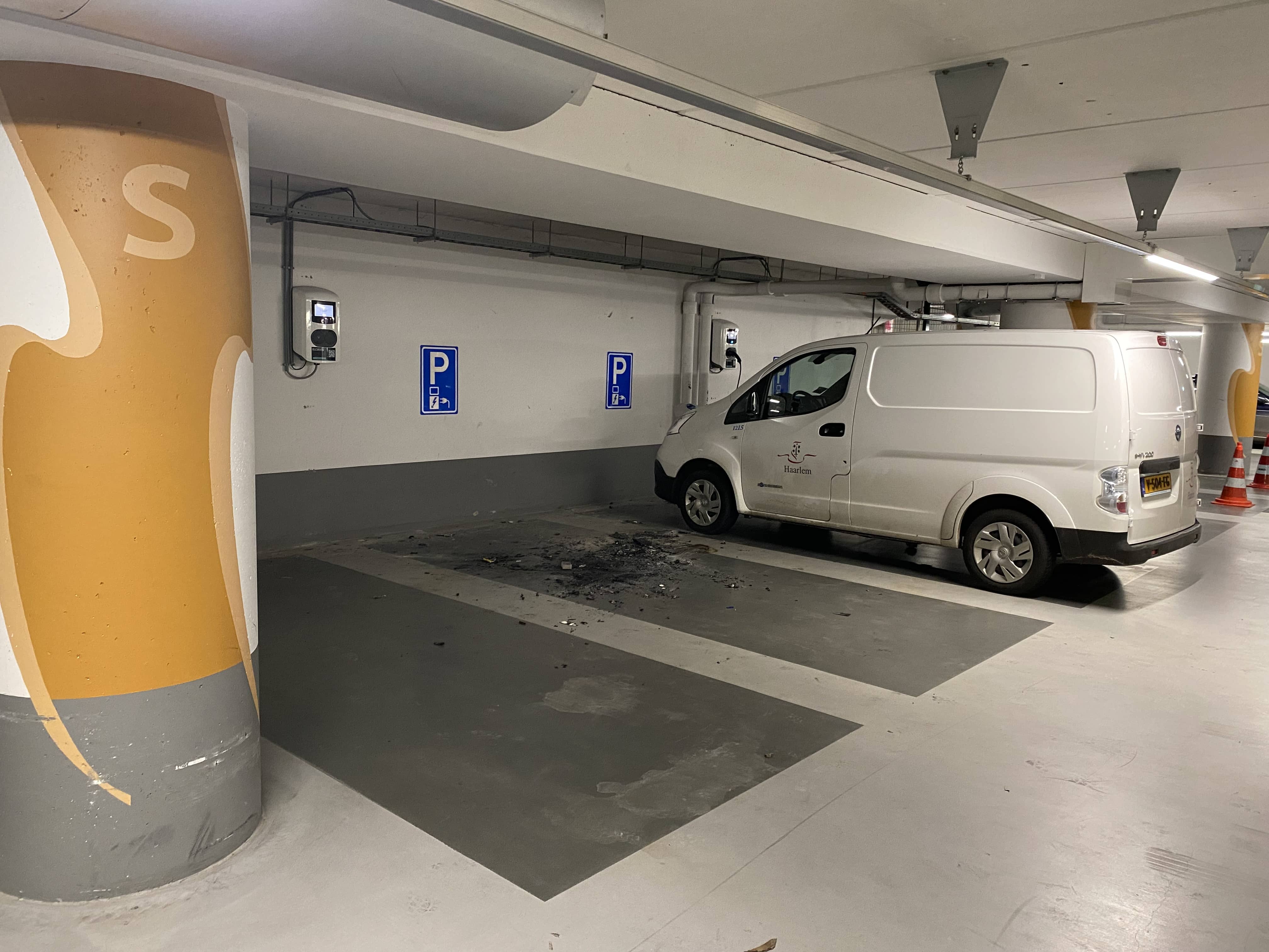 Rond 06.30 uur kwam de melding van de brand binnen en rukte de brandweer uit. Het vuur woedde vier verdiepingen onder de grond op een plek waar auto’s aan laadpalen staan. In het parkeervak zijn de brandsporen en resten duidelijk zichtbaar.