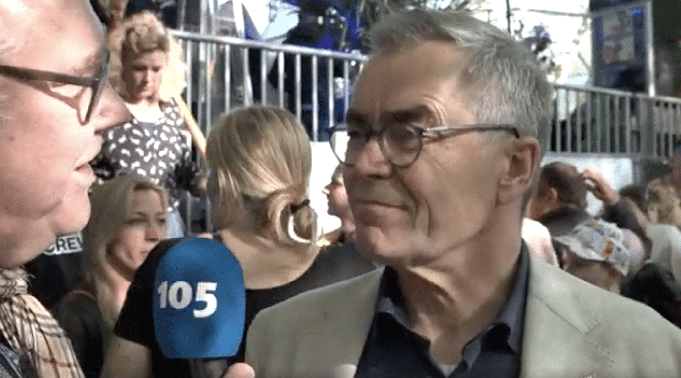 Verslaggever Jan Gaus trekt burgemeester Jos Wienen aan zijn jasje. Hoe heeft hij 4 en 5 mei tot nu toe ervaren?
