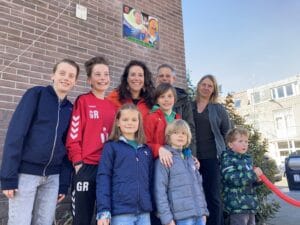 Tessa, Frido en buurvrouw Connie samen met kinderen die gevelsteen onthulden
