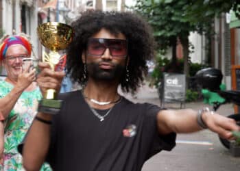 Een regenboog op de grond, de zon in de lucht: de Haarlemse Schagchelstraat veranderde vrijdagmiddag in een catwalk. Over de...