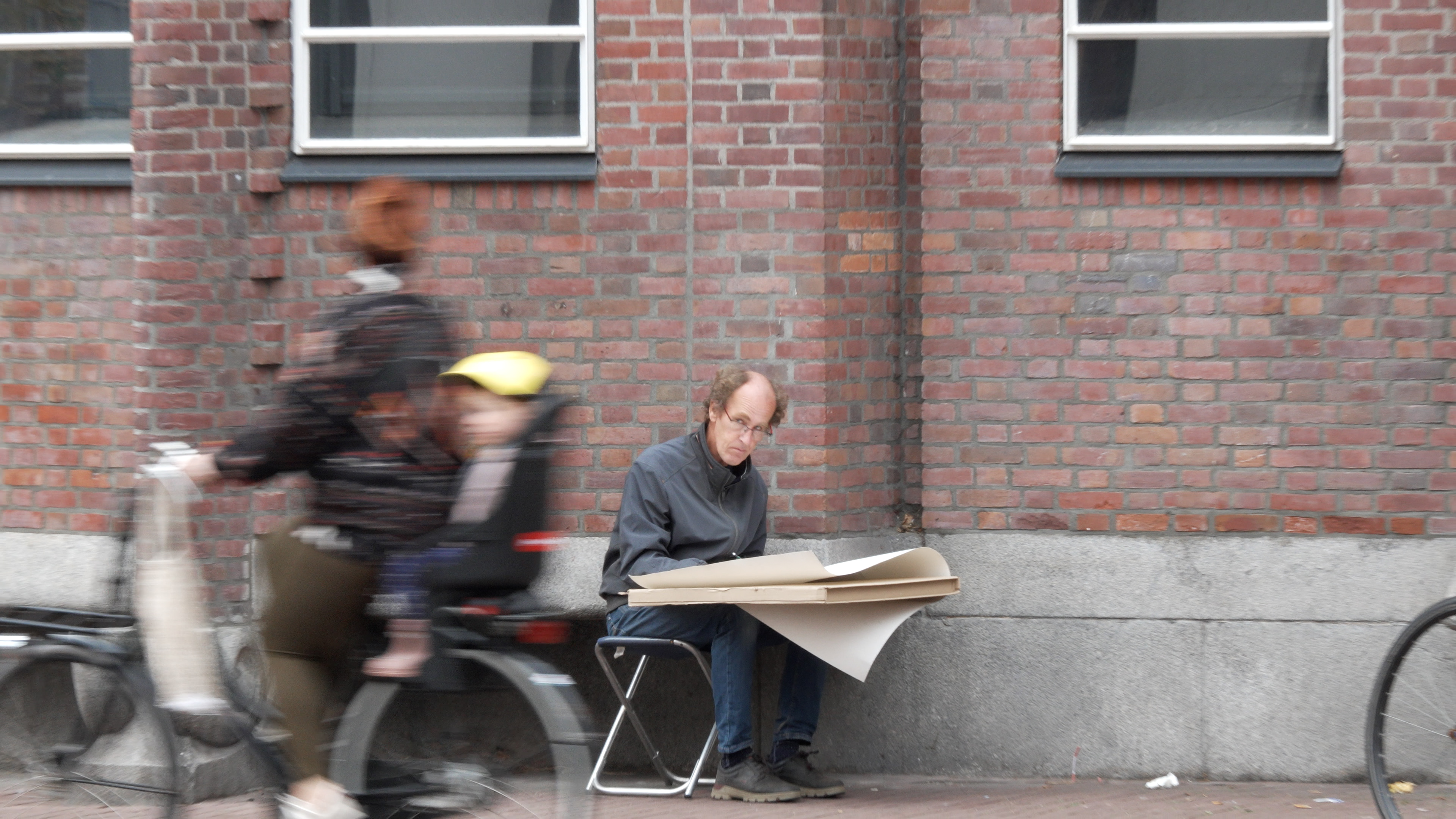 Na zijn wandeling over de Grote Markt komt Braat aan bij zijn eind bestemming. Hij zit op een krukje voor het oude postkantoor op de Gedempte Oude Gracht. Op schoot heeft hij een kartonnen doos met daarop een vel papier. Met pen tekent hij het oude bankgebouw aan de overkant, waar tegenwoordig een restaurant in zit. “Ik ben ongeveer drie maanden bezig met zo’n tekening.” Deels doet Braat dat op locatie en deels thuis.
