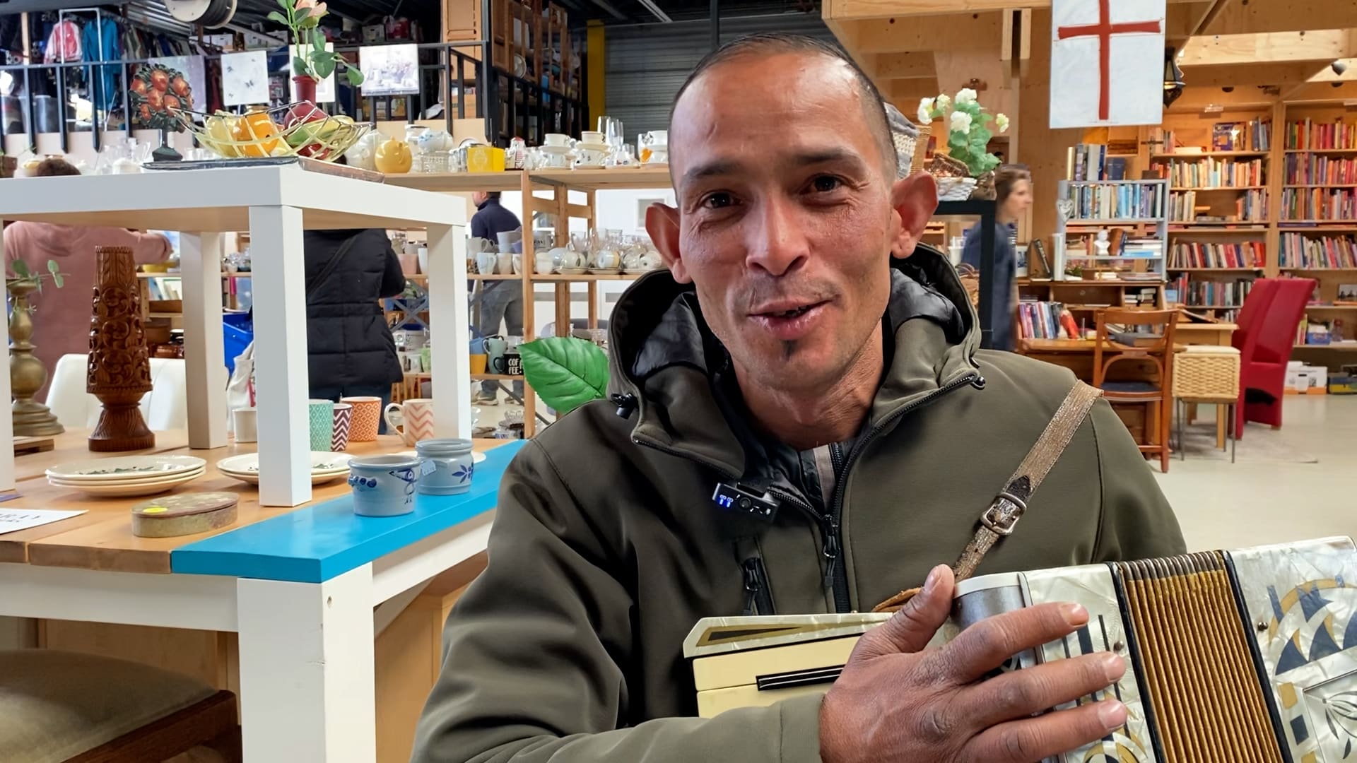 Ahmed (35) zit ondertussen in kringloopwinkel Woord en Daad te spelen op zijn nieuw gekregen accordeon. Daar hadden nog wel een tweedehands exemplaar liggen die de straatmuzikant kon gebruiken.