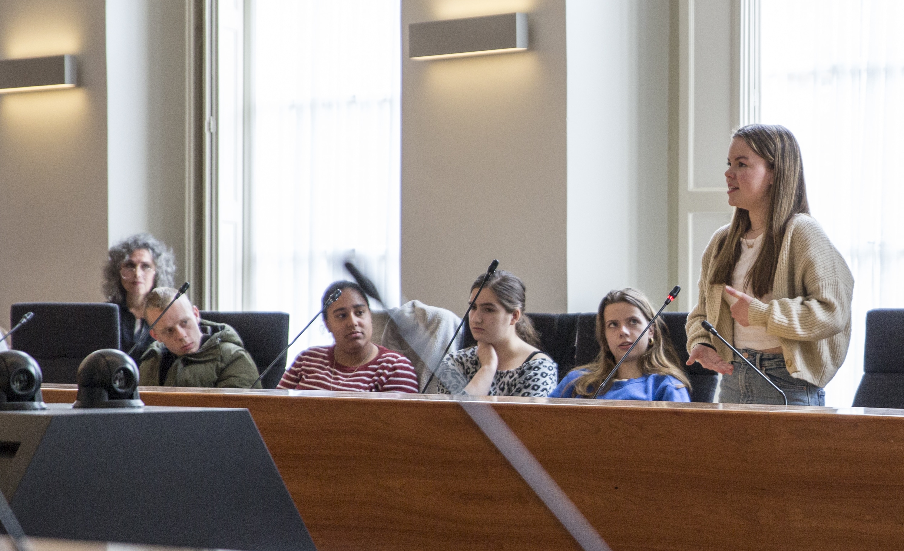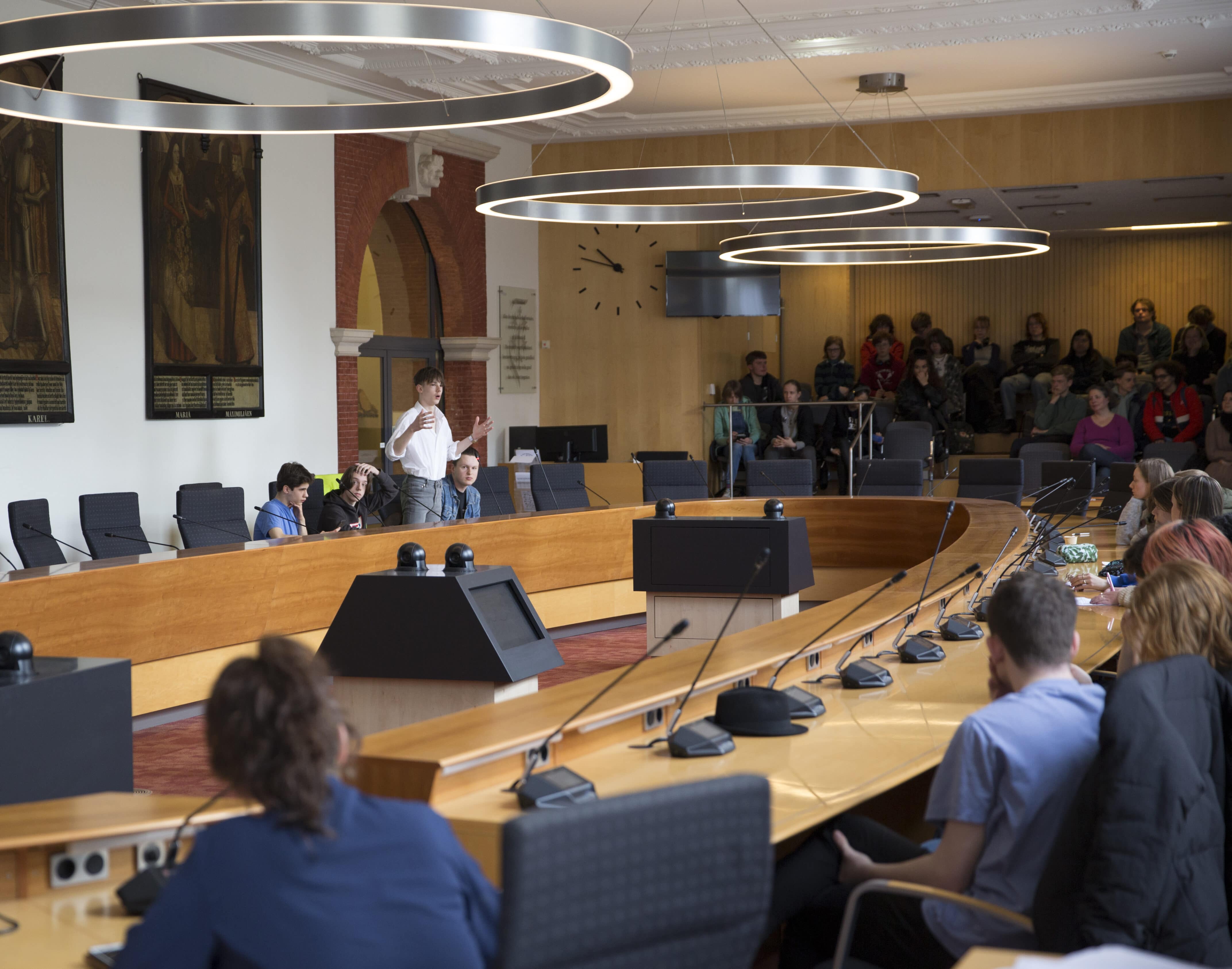 Ook de plek van het debat, de raadszaal, was voor de leerlingen indrukwekkend. Ze mochten plaatsnemen op de stoelen van de raadsleden terwijl de schilderijen van de graven van Holland op hen toekeken.