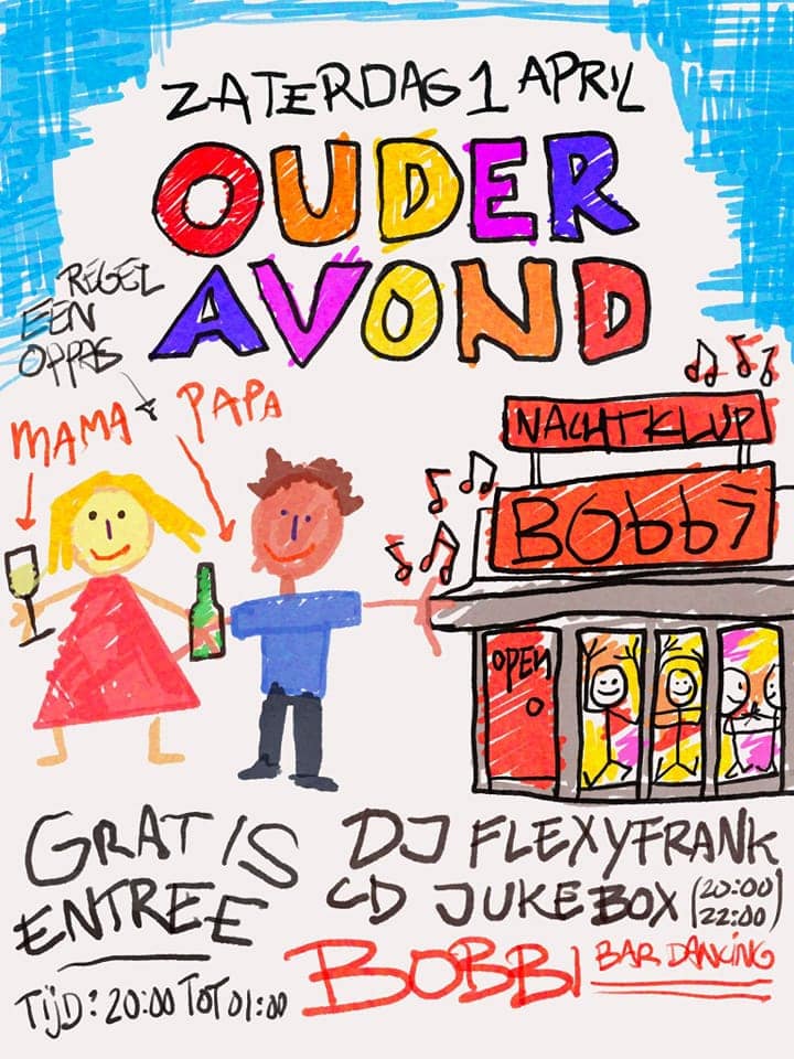 De Ouderavond is géén evenement op de basisschool, deze keer, maar een dansavond voor ‘ouders’ in het nieuwe Bobbi Bar-Dancing in Haarlem wat zaterdag 1 april voor het eerst wordt georganiseerd.