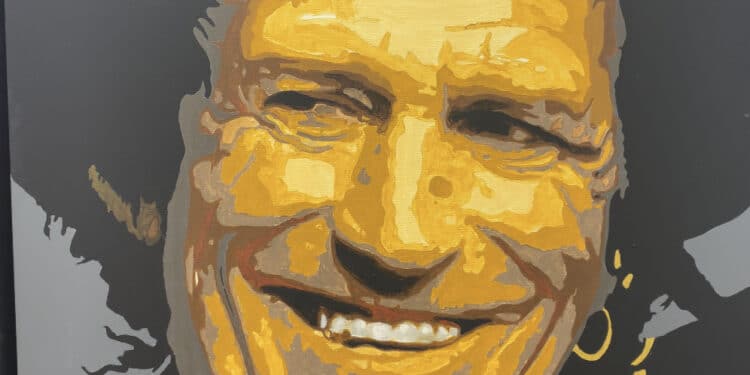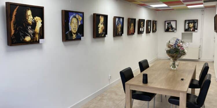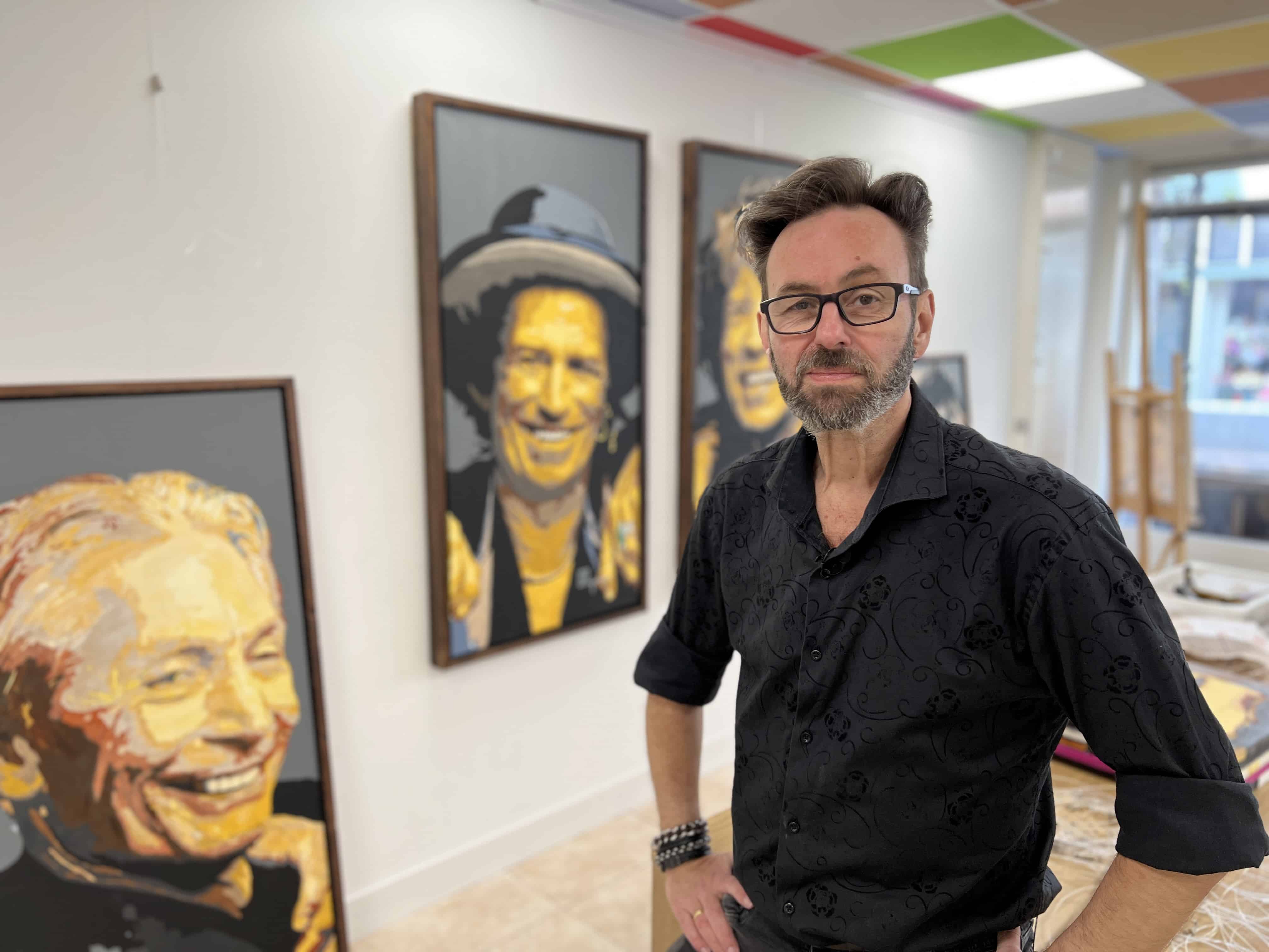 De grootste muzikanten kan je tegenkomen in de Spaarnwouderstraat in Haarlem. Kunstschilder Martin Meijer (56) heeft in de expositieruimte Het Naaiatelier zijn eerste expositie van schilderijen van beroemde artiesten en dat slaat zo goed aan dat de hele straat inmiddels vol hangt met zijn werk.
