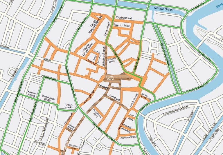 Haarlem heeft een autoluwe binnenstad met een voetgangersgebied. Hier mag niemand fietsen. De gemeente krijgt veel klachten over fietskoeriers en maaltijdbezorgers die toch hard fietsen in wandelstraten en zo voor gevaarlijke situaties zorgen. Het centrum is op het kaartje opgedeeld in drie gedeelten met verschillende regels. Verboden te fietsen en, veruit het grootste gebied, waar rekening gehouden moet worden met voetgangers. Wat overblijft zijn nu de groene routes geworden. Kaartje bekijken?