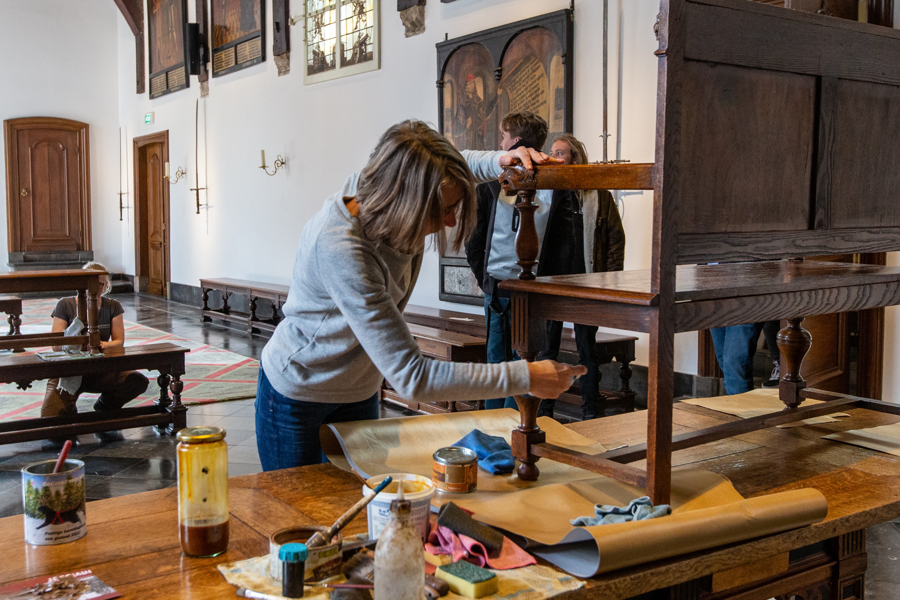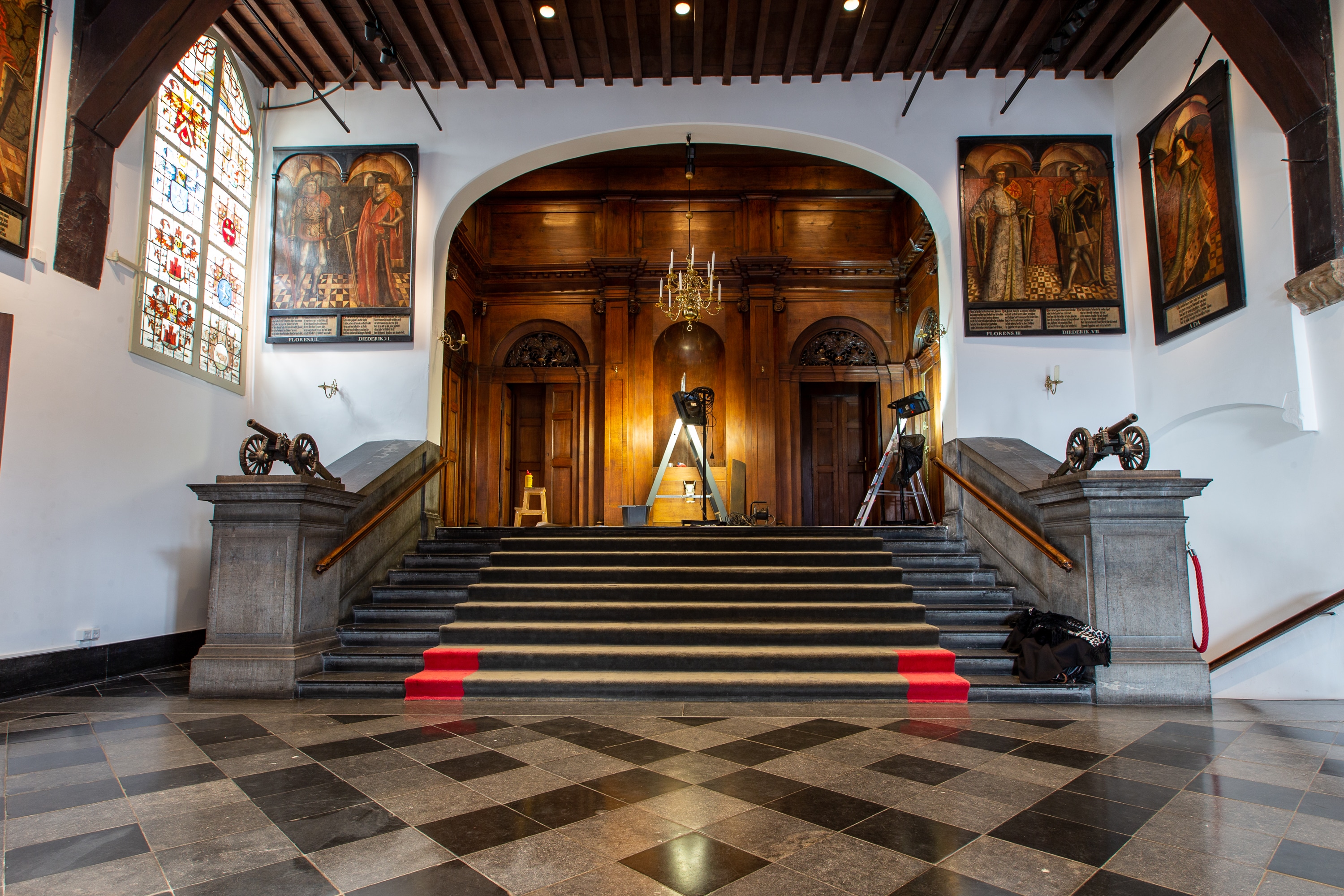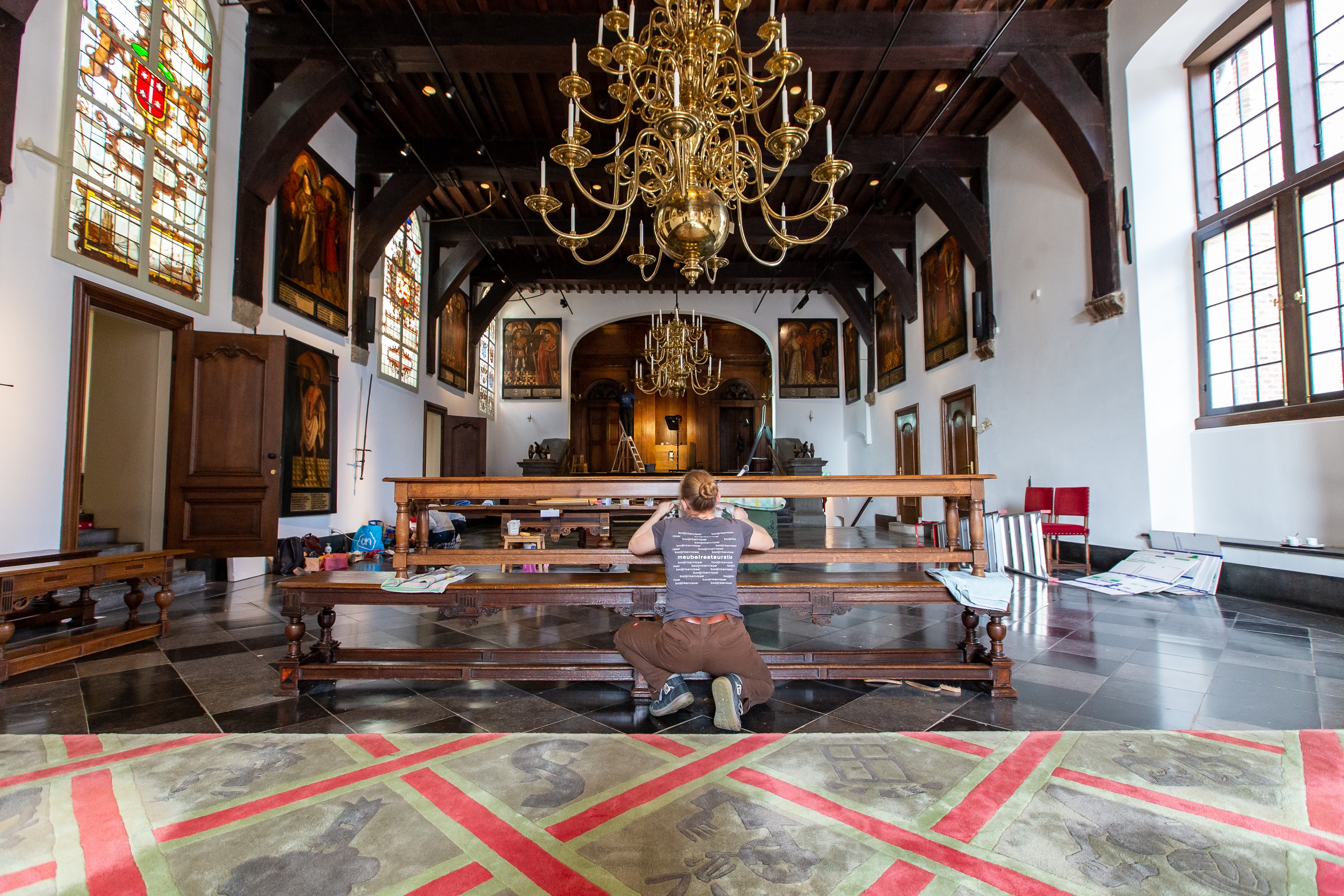 De trap die nog in de Gravenzaal op de grond ligt, kan nu mooi even gebruikt worden door de burgemeester om eindelijk eens dat giftplaatje te lezen dat aan de grootste kroonluchter hangt. “Geschenk van vrouwe Marie Henriette Previnaire”, leest hij voor. Het plaatje was hem nog niet eerder opgevallen. Maar nu de Gravenzaal even helemaal onder handen is genomen, valt het oog snel op dat soort kleine details.