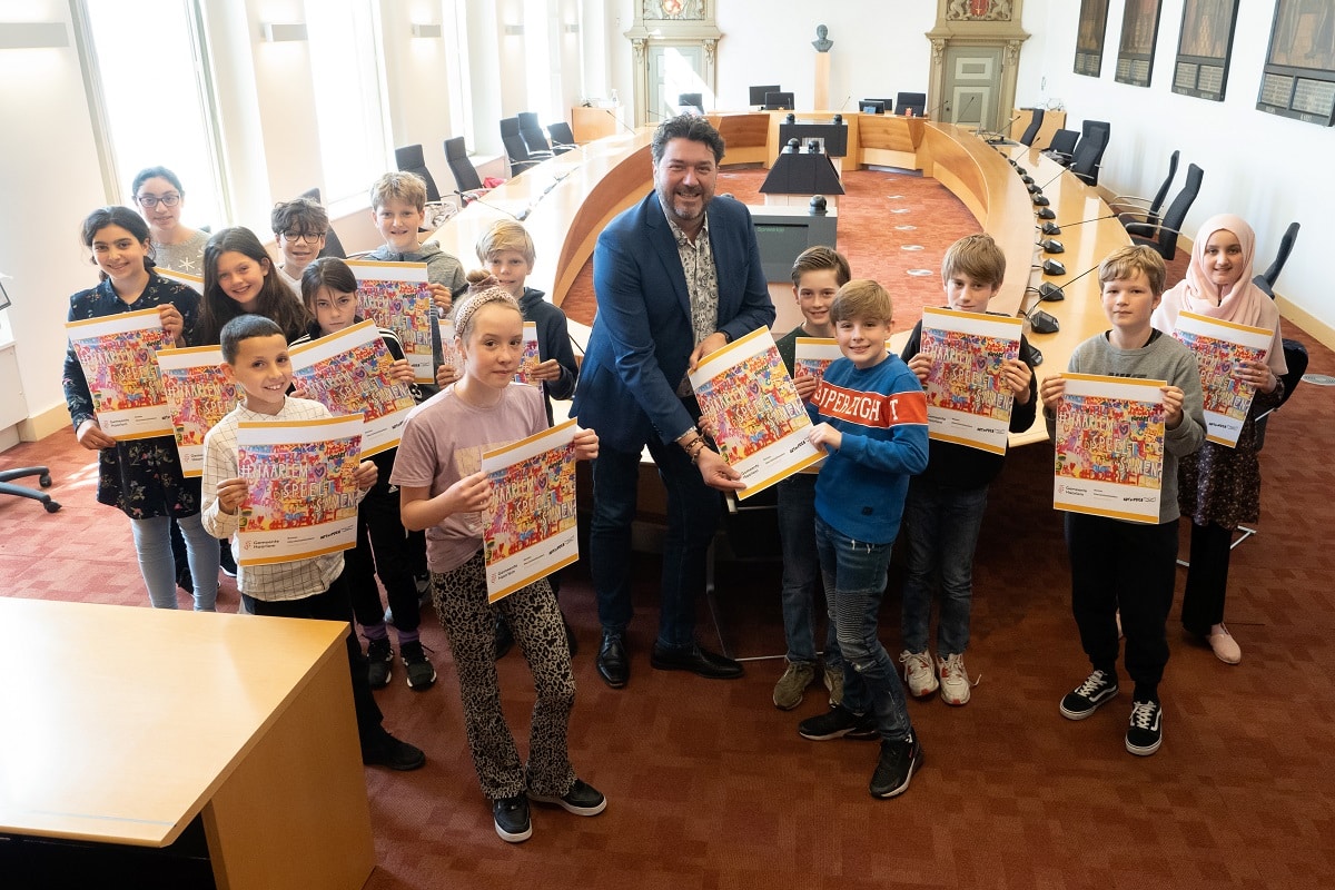 Door heel Haarlem hangt deze maand een anti-discriminatieposter bedacht door de leden van de Haarlemse Kinderraad. De kinderen ontwierpen de kleurrijke poster samen met lokale graffitikunstenaar ARTbyPDEG.