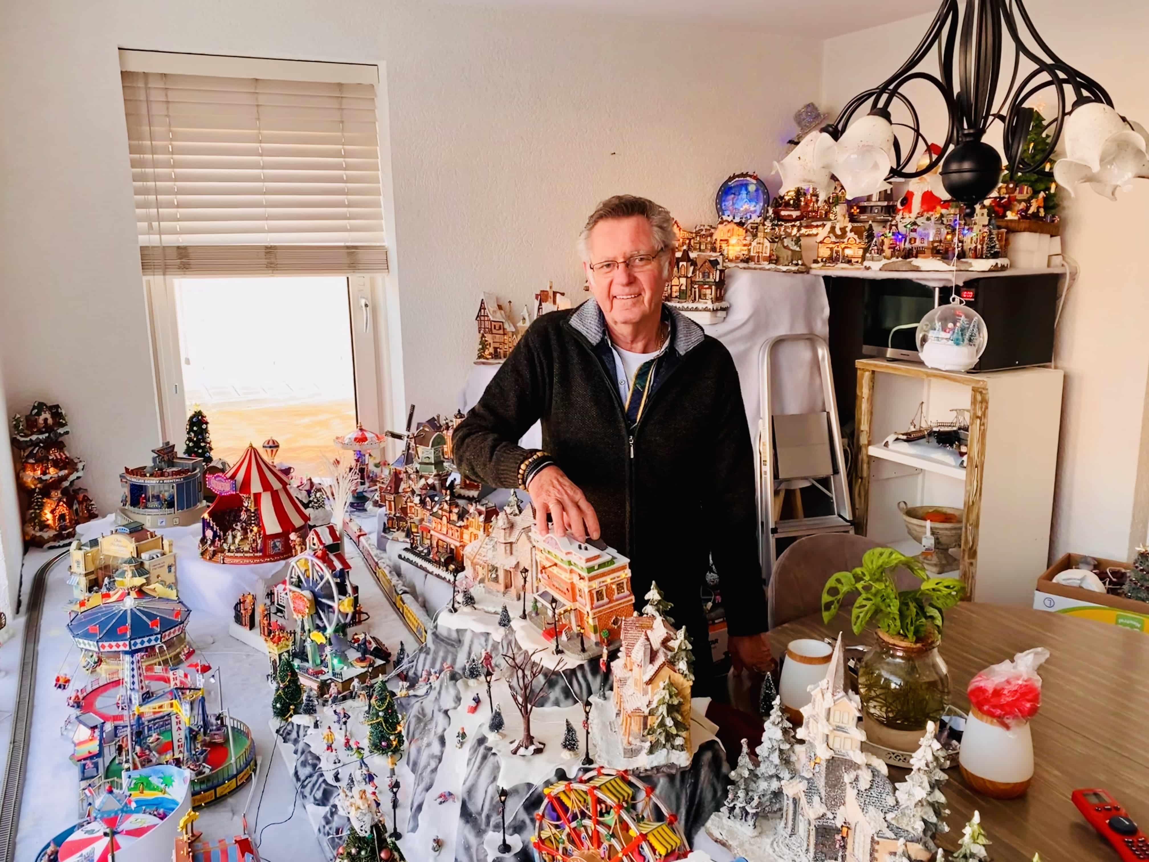 Op een speciaal daarvoor gemaakte tafel, die pontificaal voor het raam staat, heeft Willem uit Bennebroek zijn winterwonderland gebouwd. Wanneer hij de stekker in het stopcontact steekt, beginnen de draaimolens te draaien, blink de miniatuur straatverlichting en klinkt er – natuurlijk – een kerstmuziekje.