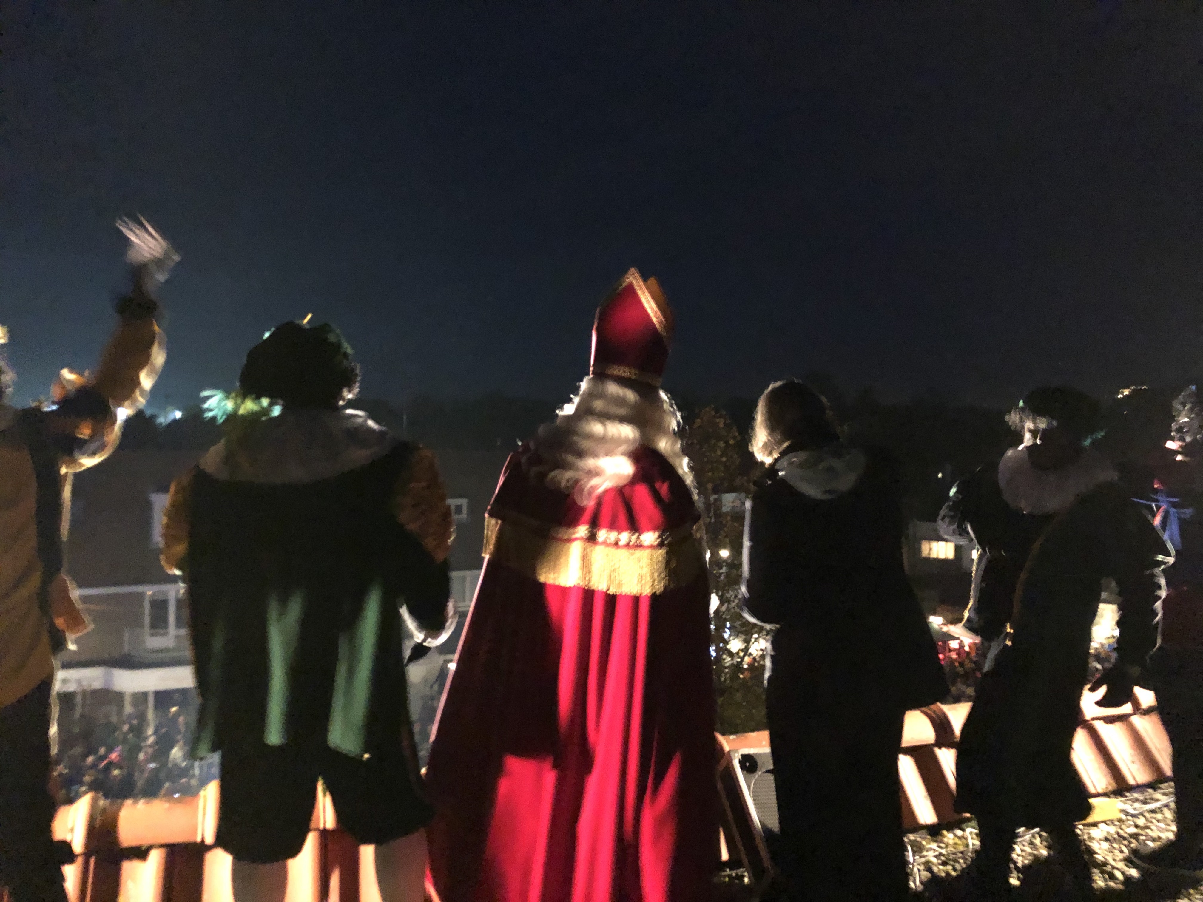 De Jan van Goyenstraat in Heemstede stroomde zondagavond traditiegetrouw weer vol met kinderen om Sinterklaas en zijn pieten te bewonderen op het dak van een van de panden in de winkelstraat.