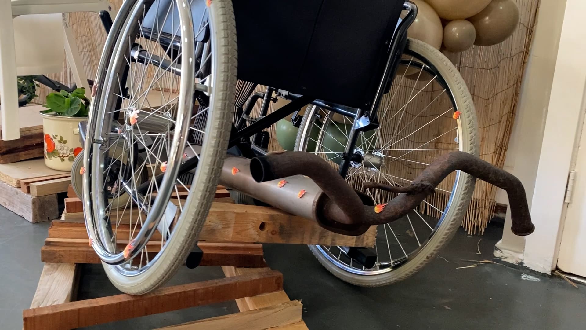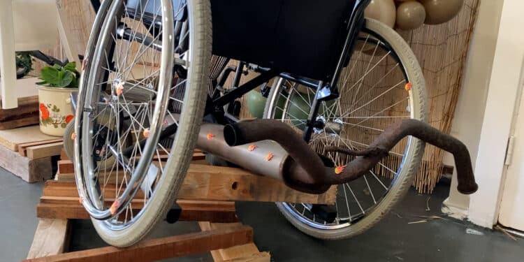 Een rolstoel met sportuitlaat en vlammen in de expositie