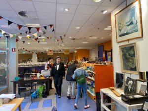 Ter gelegenheid van het jubileum is er extra entertainment ingevlogen in de gedaante van de Pipoclub. “We hebben nog niet eerder trucs in de kringloopwinkel gedaan. Het is nog rustig maar ik verwacht dat het drukker wordt”, vertelt goochelaar Ab. Zelf woont hij in Heemstede, waar sinds vijf jaar ook een Snuffelmug zit. “Ik kom regelmatig bij de Snuffelmug, maar ook bij de andere kringloopzaken in de omgeving.”