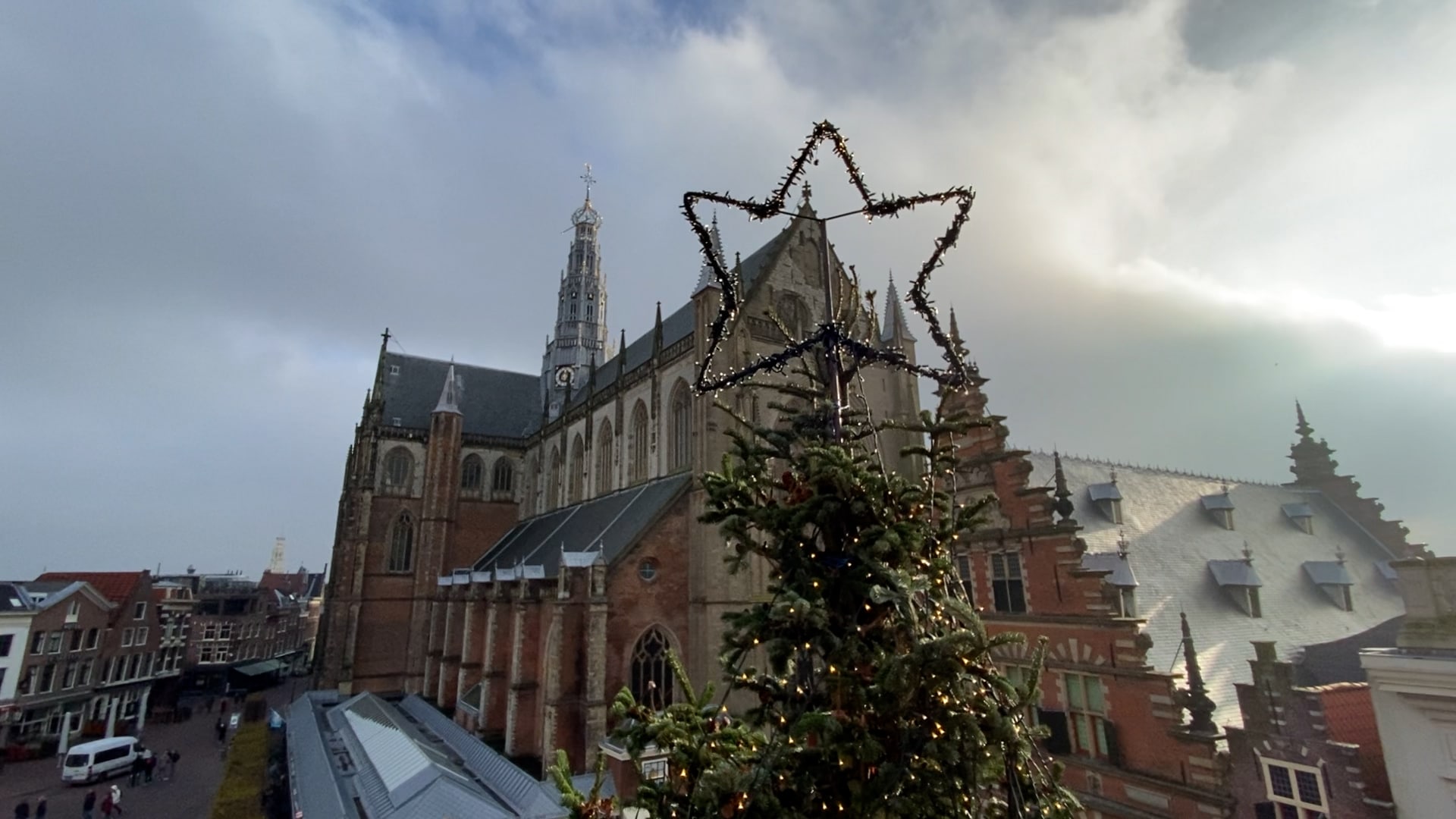 Het is koud en donker als de kerstboom afgelopen maandag vroeg in de ochtend arriveert op de Grote Markt in Haarlem. Met een enorme telekraan wordt de boom in een speciaal gat in de grond gehesen, daarvoor moet de stam wel op maat worden gezaagd.