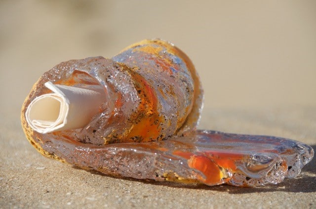 Van der Linden werkt met warm en koud glas in combinatie met natuurlijke materialen zoals vilt, leder, hout, vlas en kokosvezels. Hij laat mij een oester zien ( foto 1) die hij heeft gevormd in een kom van de IKEA met bruintinten glas en aan de binnenkant bekleed met vilt. “Kijk, hierin kan men een herinnering aan een dierbaar persoon bewaren. Denk hierbij aan een brief, de as van een overledene, sieraden”. Oscar geeft het kunstwerk de naam “Schatplaats”. Op zijn website staan de mogelijkheden die Oscar biedt onder de kop “Aandenken en herdenken”.