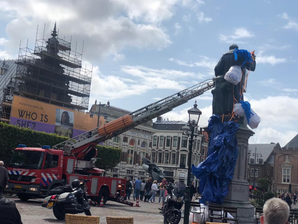 Het standbeeld van Laurens Janszoon Coster is weer zichtbaar op de Grote Markt in Haarlem. Kunstenaars hadden het beeld vorige week ingepakt, maar dat bleek achteraf gezien een gevaarlijke situatie op te leveren.