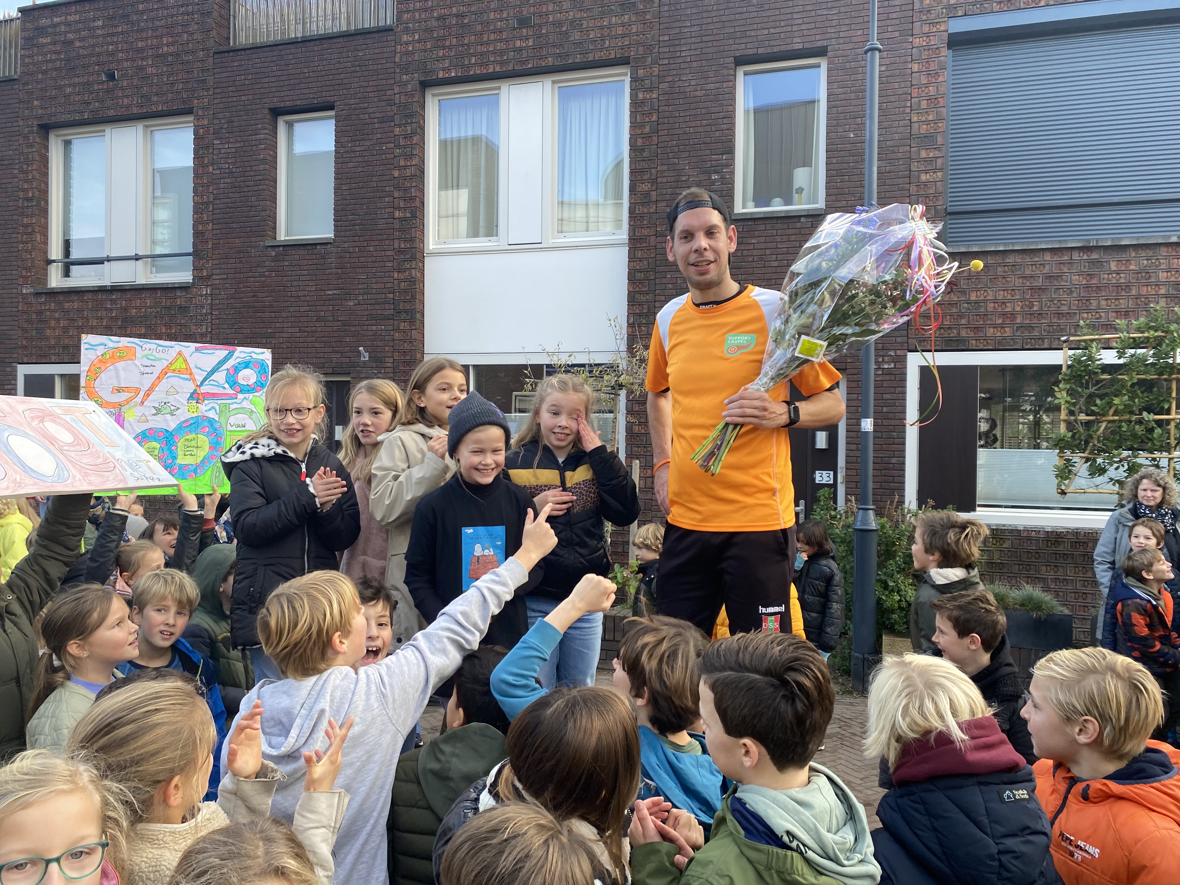 Hun meester Sjoerd moet op dat moment nog 100 meter van zijn laatste halve marathon afleggen. Als hij goed luistert, kan hij het geschreeuw van de leerlingen al horen.