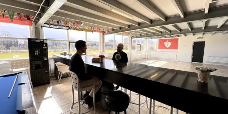 Aan een hoge tafel zitten Elie en Ali, laatstgenoemde is de penningmeester van deze voetbalclub, waar hij ook jeugdlessen geeft. Elie zit tegenover hem met op tafel een papiertje met aantekeningen.