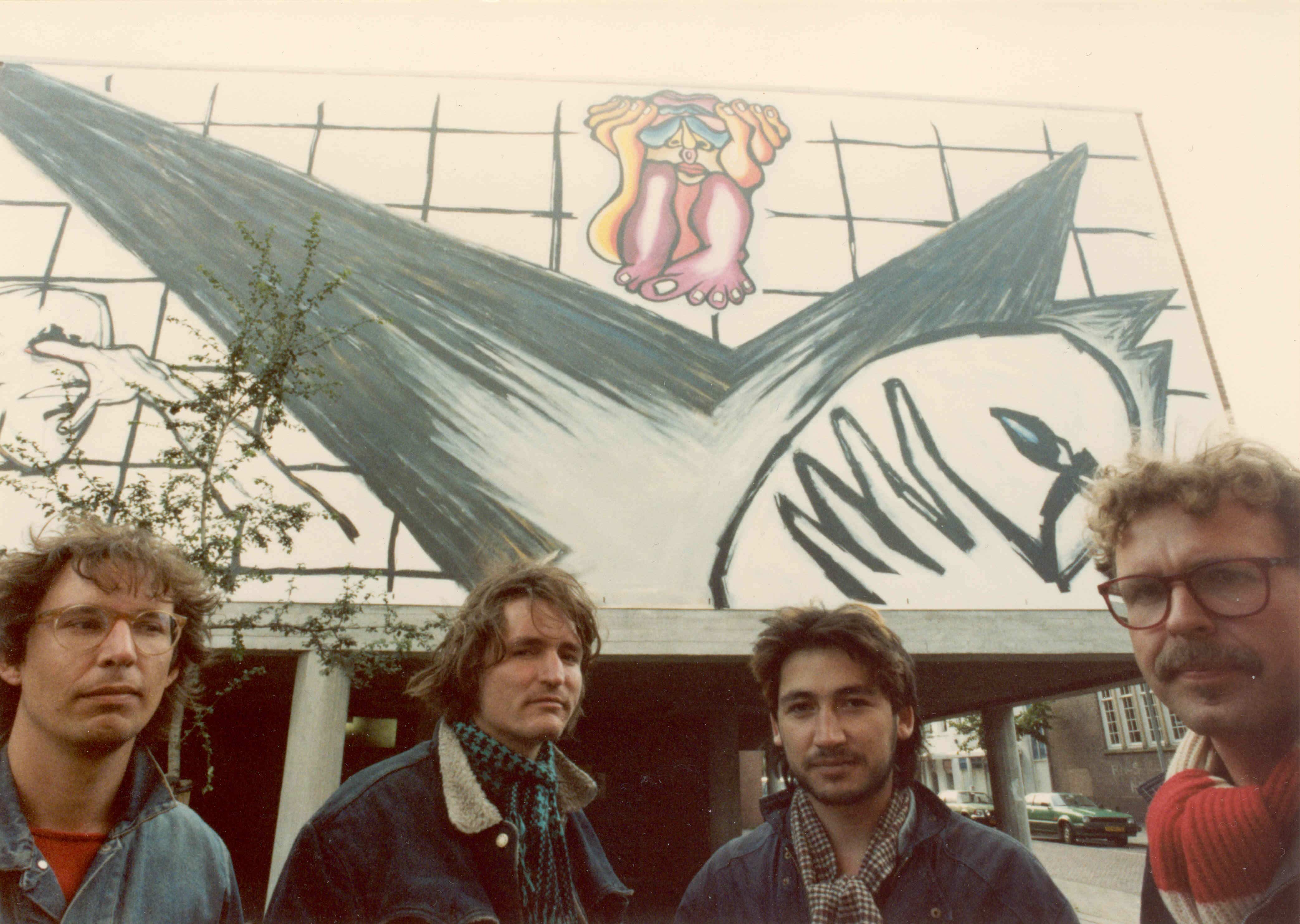 Kunstenaar en Haarlemmer Piet Zwaanswijk heeft aan de hand van een foto uit 1985 zijn nieuwe muurschildering gemaakt in een fietsenstalling aan het Doelenplein. Op de foto is te zien hoe vier kunstenaars werken aan een grote muurschildering net buiten de fietsenstalling.