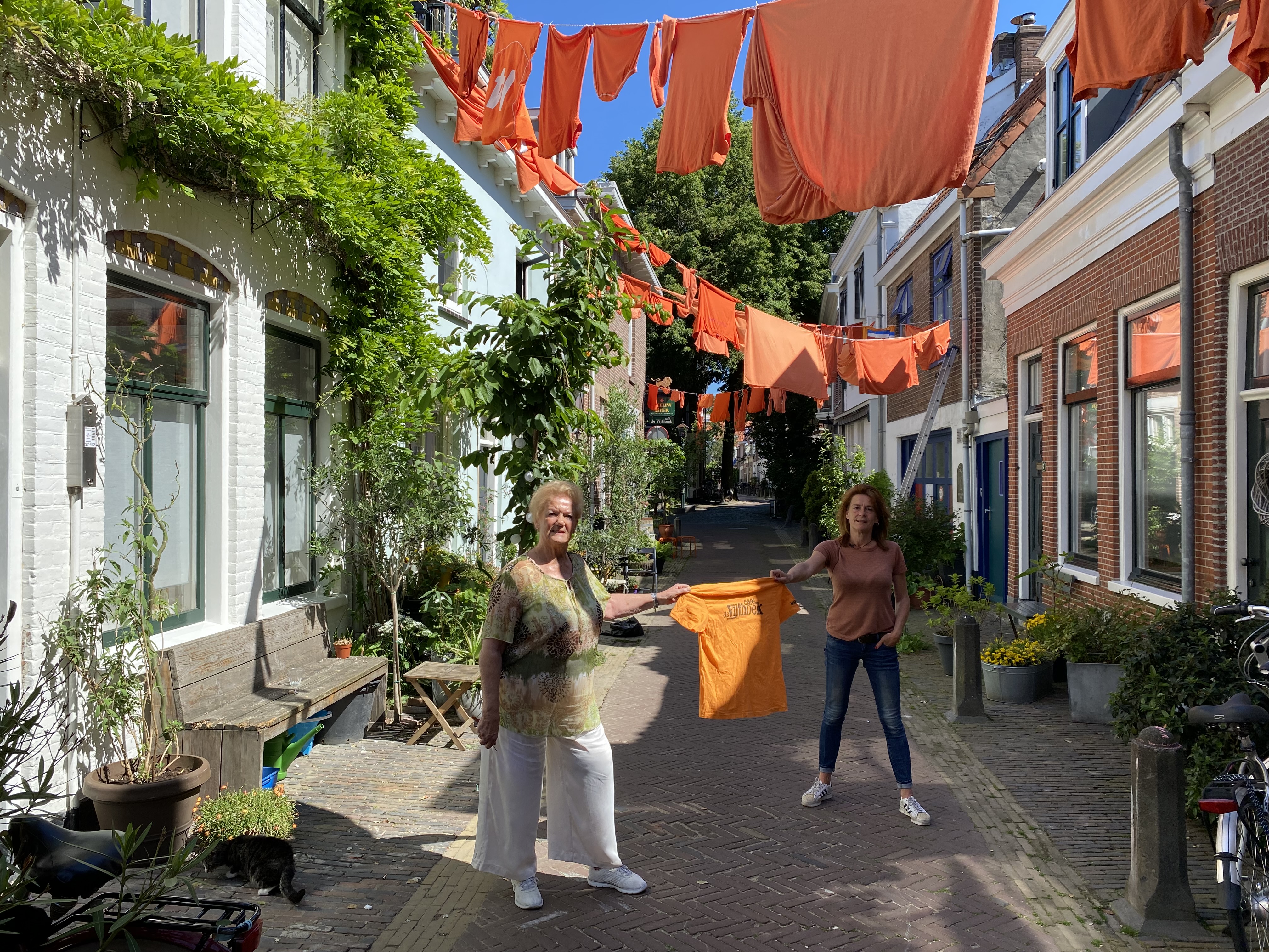 In de Lange Raamstraat in Haarlem hangen ze niet de vuile, maar oranje was buiten. In de straat hangen hoog in de lucht oranje T-shirts, broeken, sokken en zelfs twee bh’s. De kleding is ingezameld en met een speciale kleurstof oranje gewassen om de voetballers vanavond te steunen. Maar van wie de bh’s zijn ‘’blijft een geheim van de straat’’