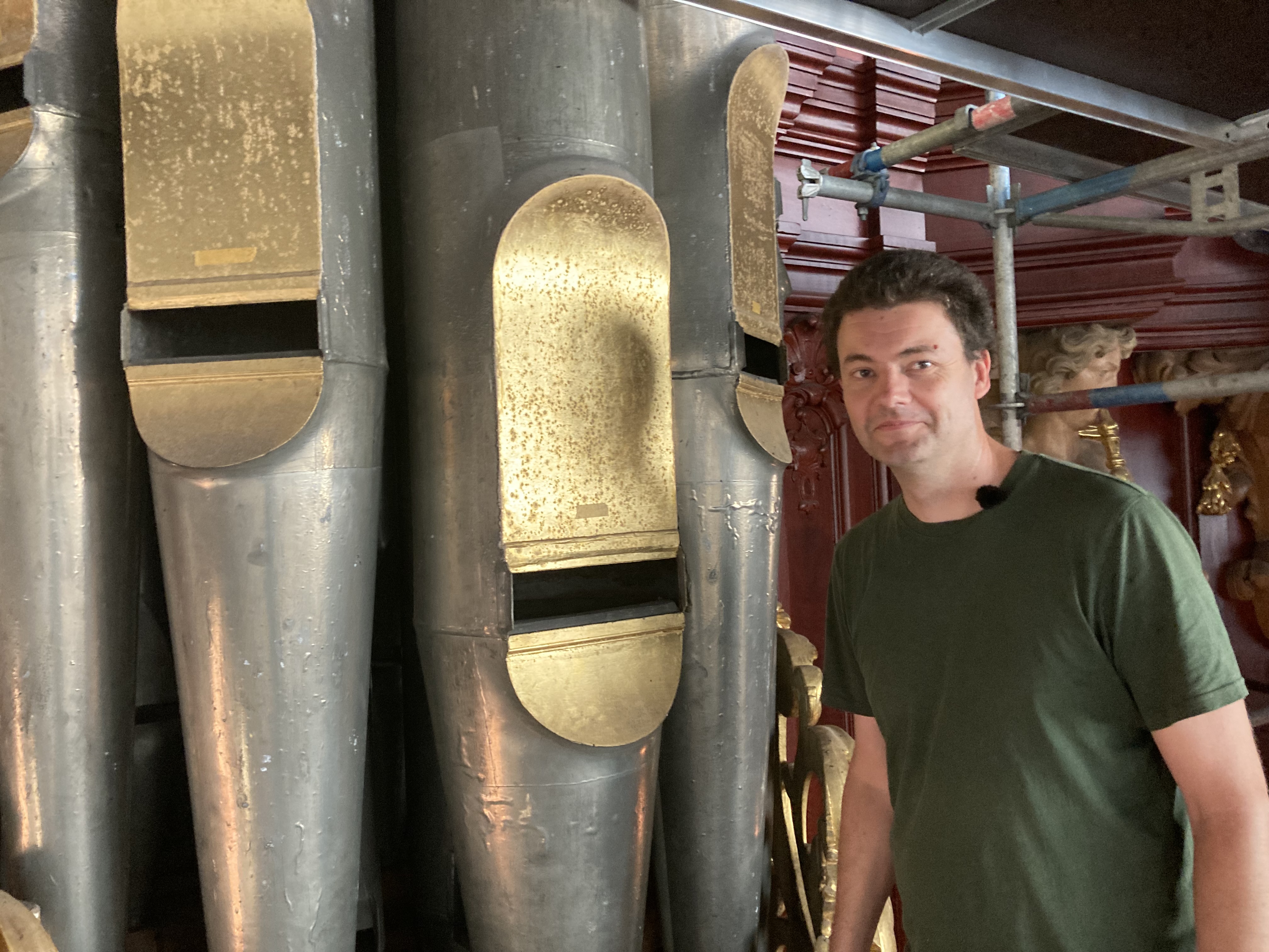 Orgelrestaurateur Erik Winkel vindt tijdens het weghalen van de pijpen nu vaak een dode vleermuis. “Ja, hier gisteren in een hoekje nog eentje weggehaald.” Hij hoopt dat ze wegblijven als hij eenmaal de schone orgelpijpen over acht maanden terug plaatst.