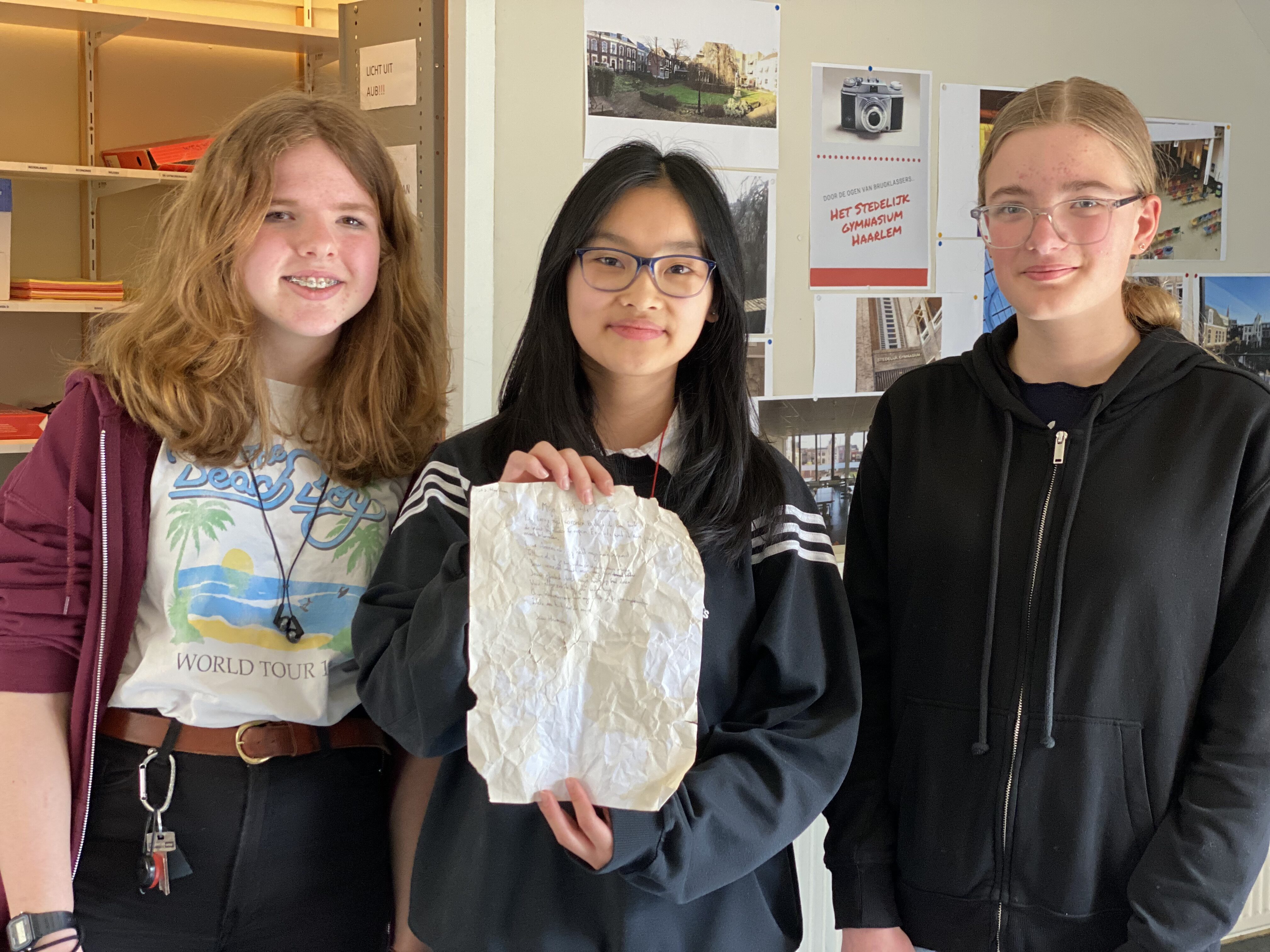 In een artikel dat vandaag verscheen op de website van het Stedelijk stond dat de leerlingen Hannah van der Heijden, Anjali Yung en Liesbeth Hannema een dik vijftig jaar oude liefdesbrief hebben gevonden.