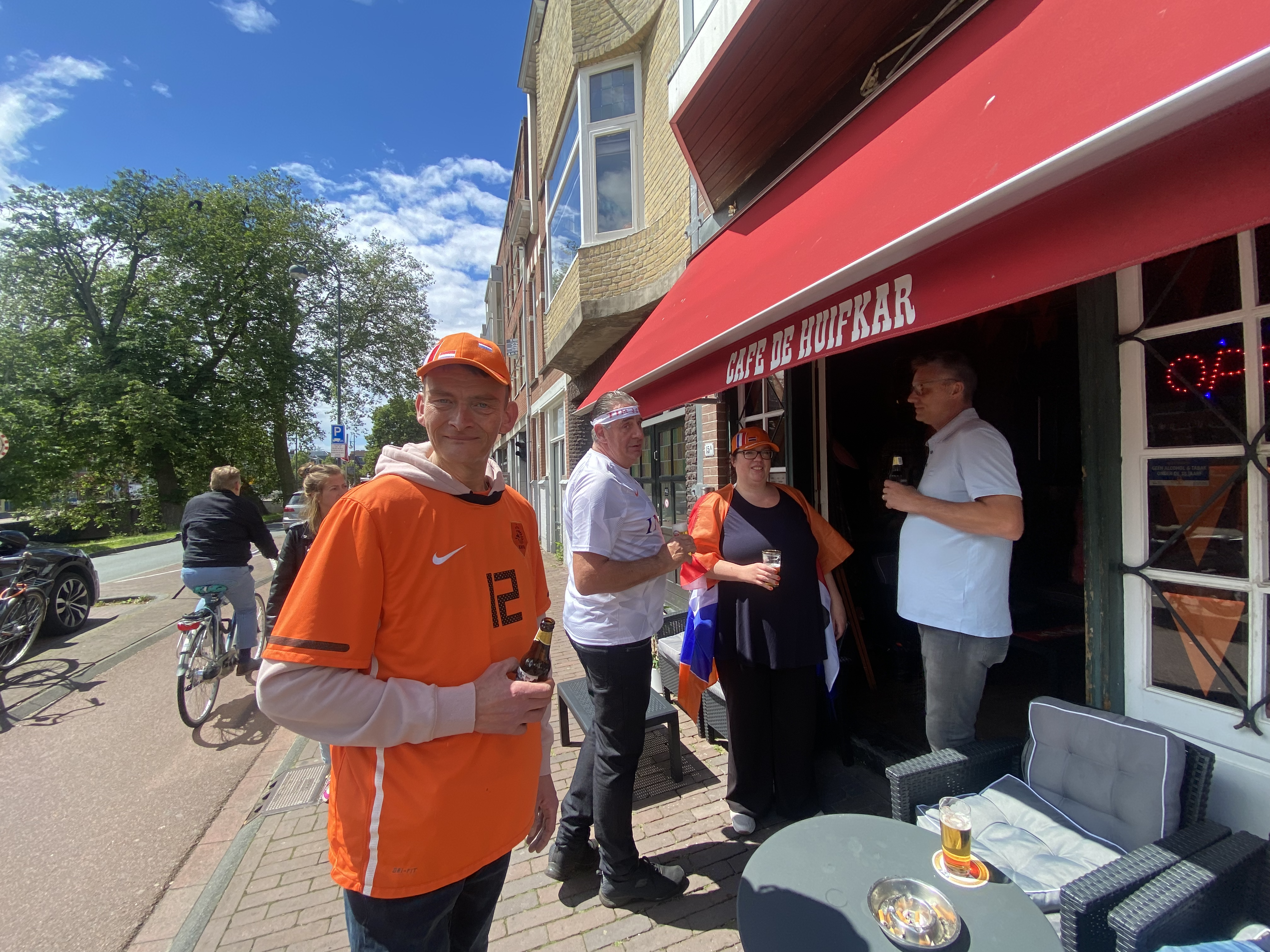De Haarlemse binnenstad kleurt nog niet echt overtuigend oranje, maar in verschillende kroegen is de oranjekoorts wel toegeslagen. René komt al een kleine dertig jaar bij zijn Café de Huifkar: “Het is het mooiste café van Haarlem. Hier moet je zijn voor de wedstrijden. Of bij Café ’t Hoedje en Café de Hoek.” Binnen wapperen er oranje vlaggen en de bar biedt goed uitzicht op het scherm.