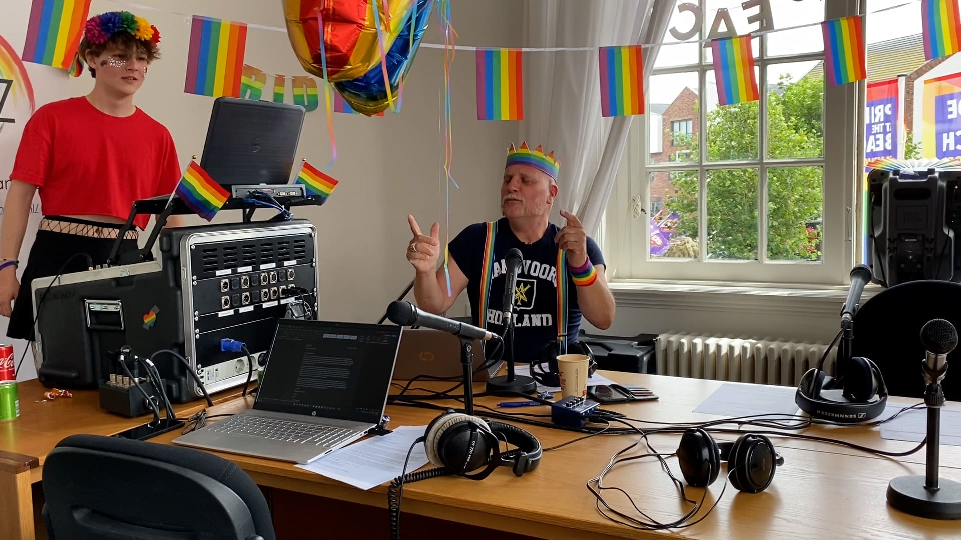 Een van de presentatoren is Ronald Hueskens, mede-organisator van Pride at the Beach. “Normaal maken we iedere eerste maandag van de maand op ZFM een radioprogramma en vandaag maken we een speciale editie vanuit het gemeentehuis. We hebben de speakers uit het raam gezet zodat iedereen buiten die boodschappen doet, ons programma kan volgen.”