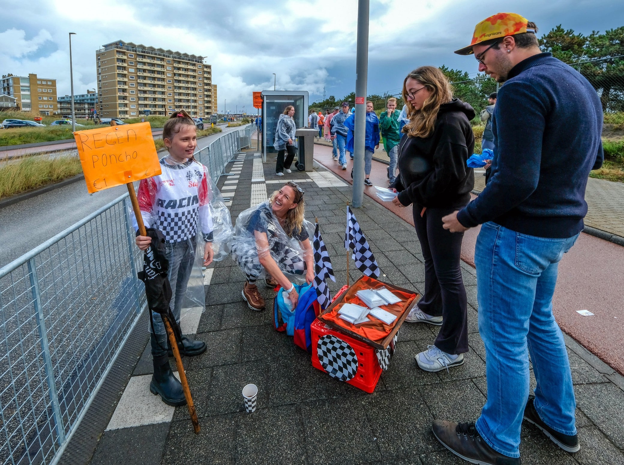 Op het terrein van het circuit is het niet toegestaan om een paraplu mee te nemen. Een slimme verkoopster sprong daar handig op in door langs de route naar het terrein poncho’s te verkopen.