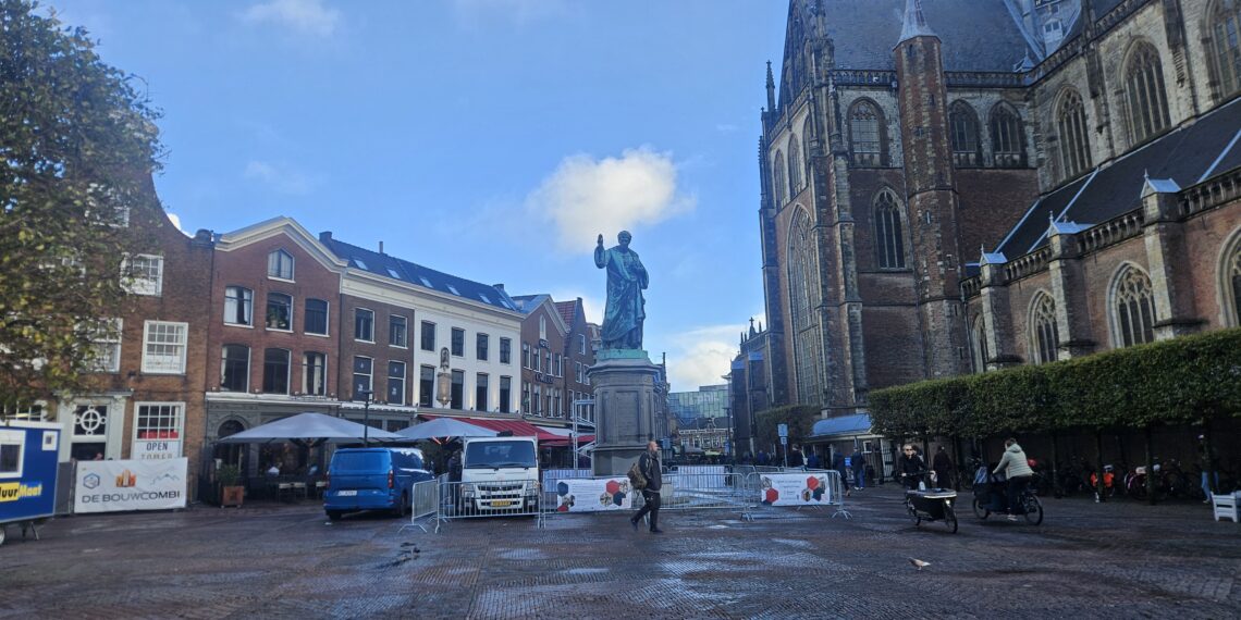 Sinds gisteren staat het standbeeld van Laurens Janszoon Coster op de Grote Markt in Haarlem achter dranghekken. De sokkel van het bijna 170 jaar oude beeld wordt de komende weken gerestaureerd.