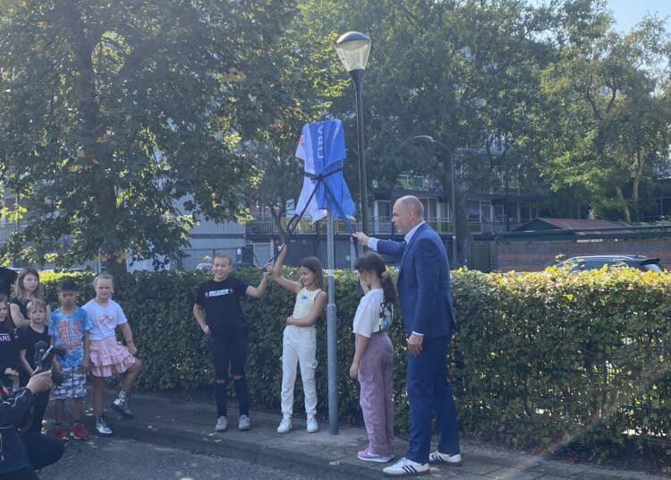 Om de buurt uit te nodigen voor de onthulling hebben leerlingen van de naastgelegen Franciscus Xaveriusschool een flyer gemaakt. Zij waren ook aanwezig bij de onthulling van het bord.