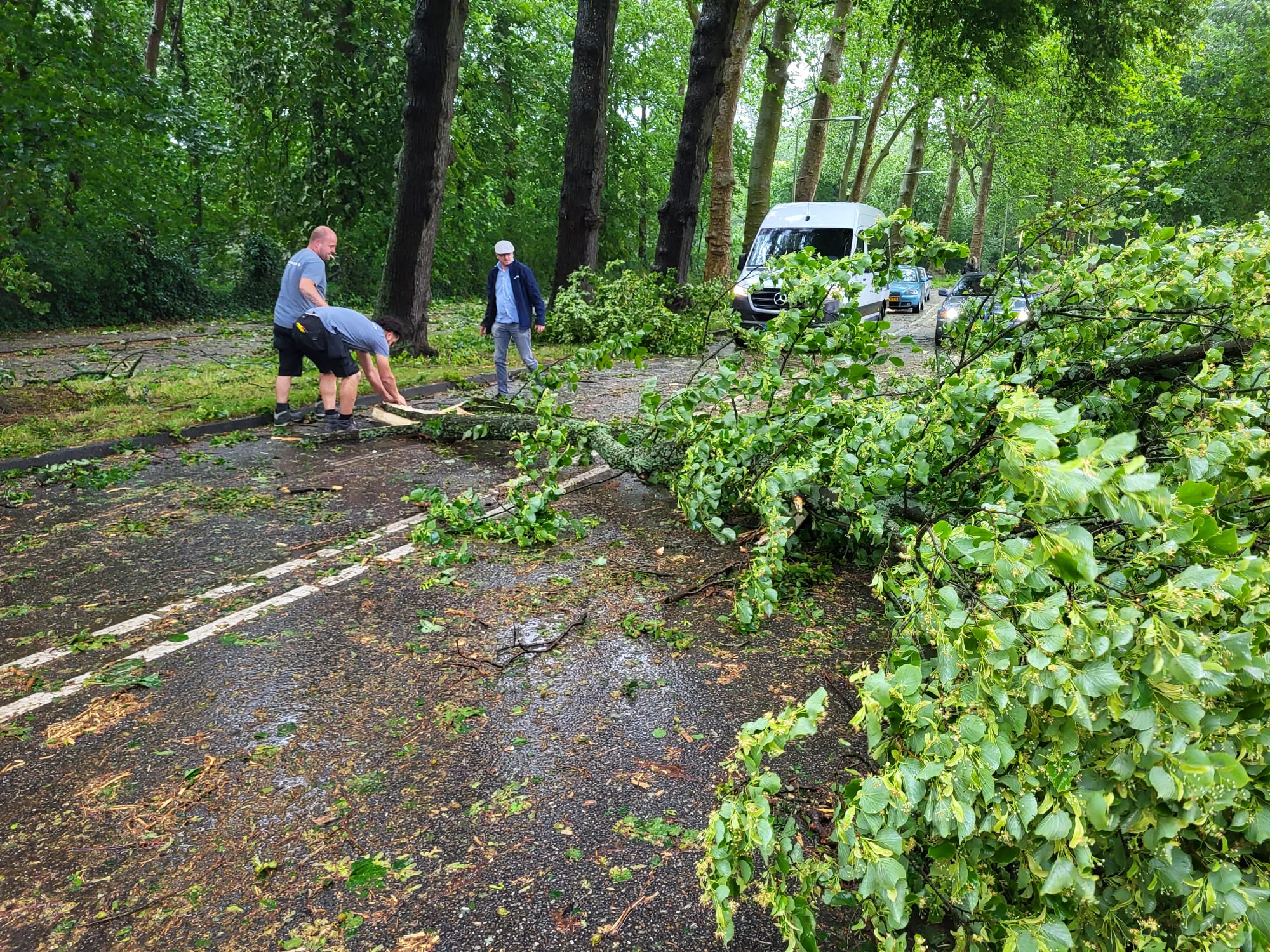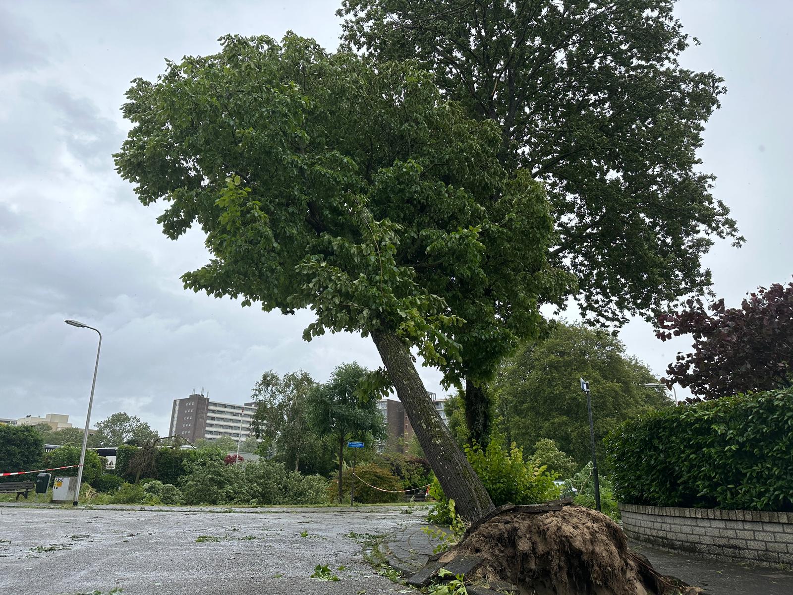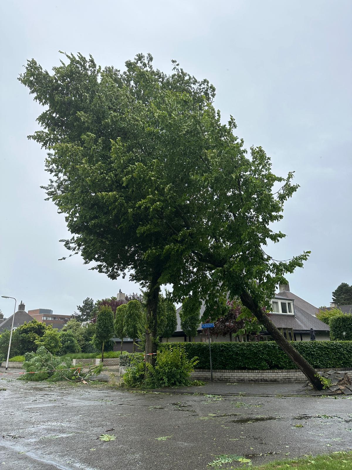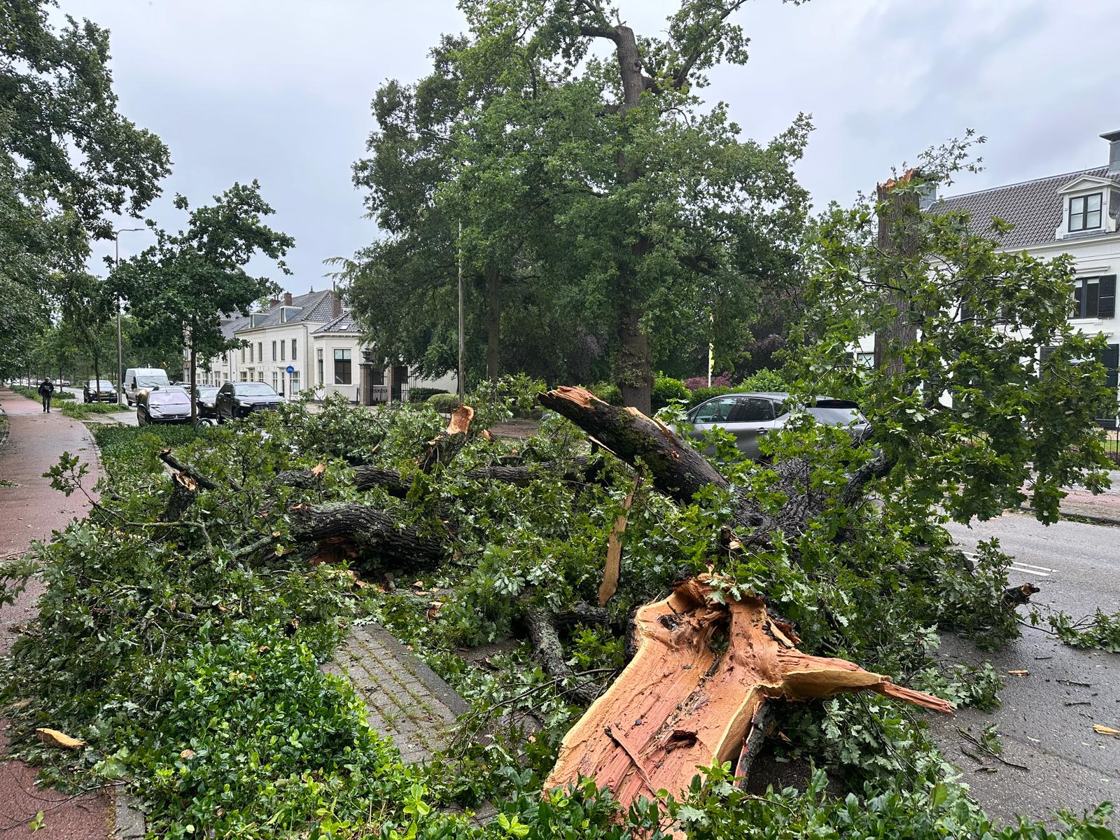 “Wij zagen veel mensen rondjes rijden in de straat en kwamen er pas later achter dat aan beide kanten van de straat een boom is omgevallen”, vertelt Timmer. Vlak nadat ze naar buiten gingen vielen ook andere bomen om in de straat. “Ik zag ze om knikken als saté prikkers zo op de huizen van de buren. Er zijn nu in totaal zes bomen om”, meldt Dieuwke.