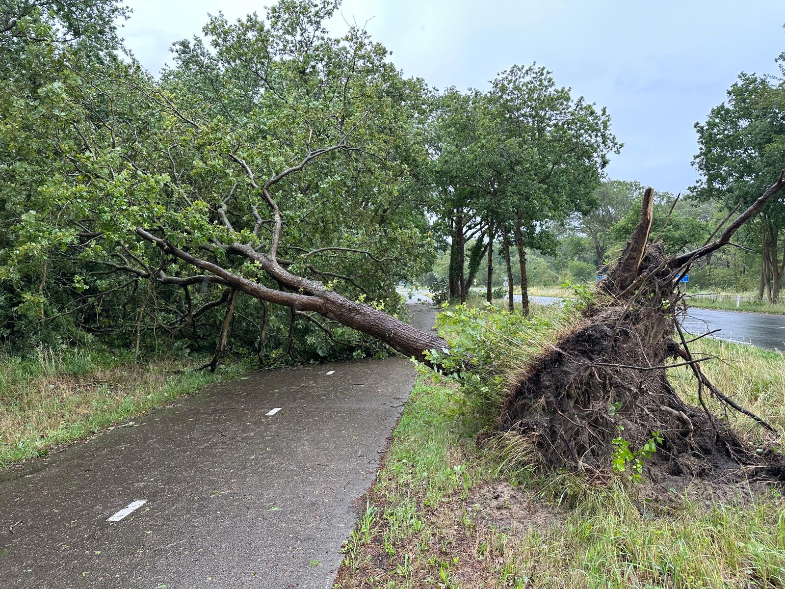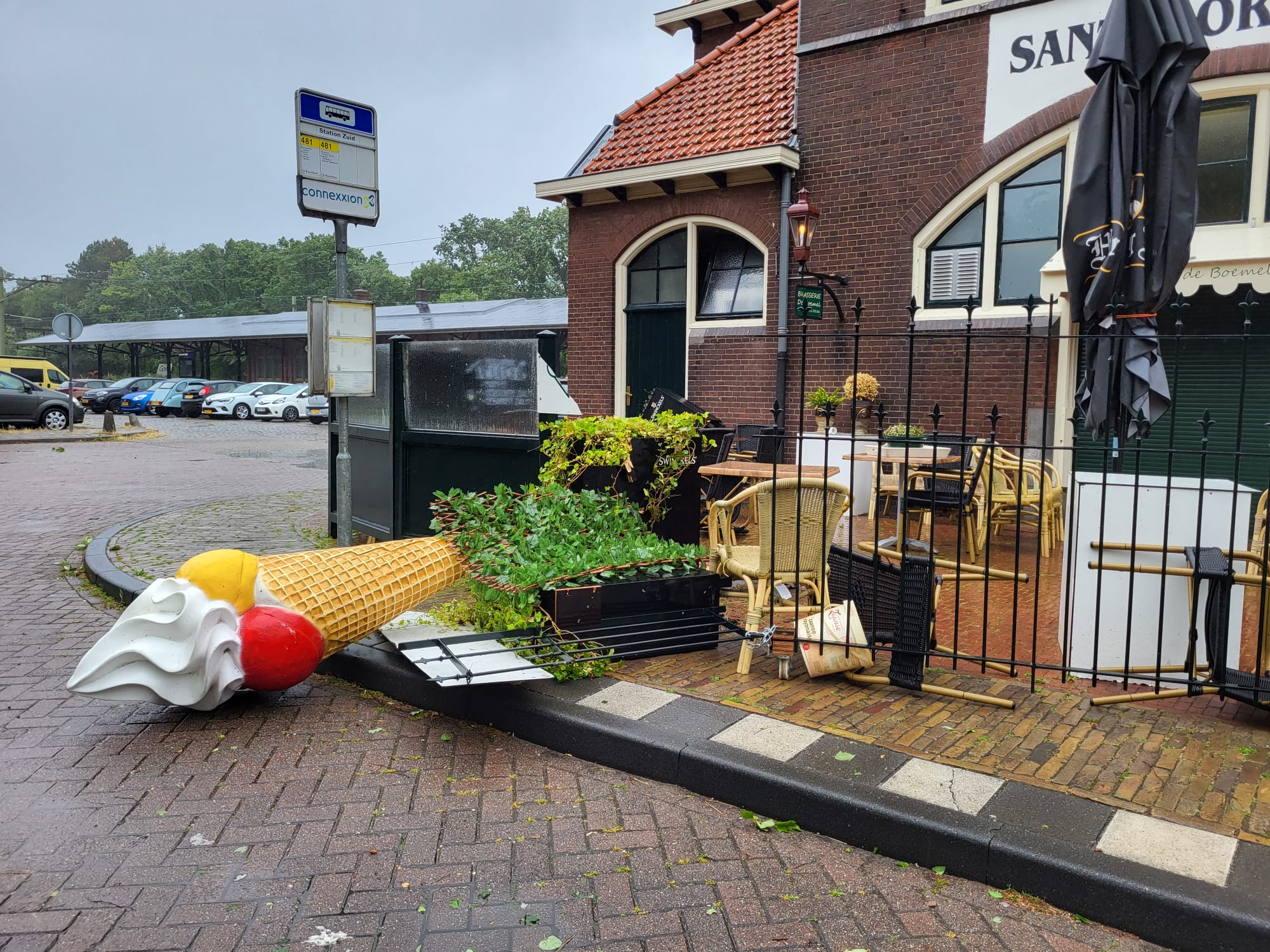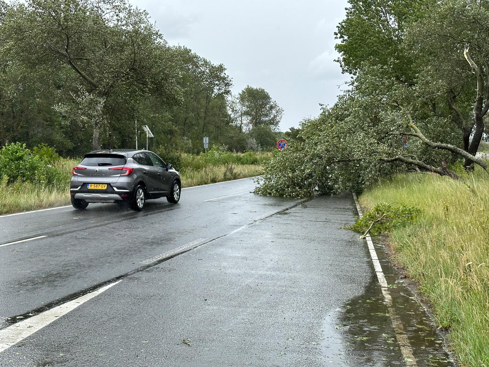“Wij zagen veel mensen rondjes rijden in de straat en kwamen er pas later achter dat aan beide kanten van de straat een boom is omgevallen”, vertelt Timmer. Vlak nadat ze naar buiten gingen vielen ook andere bomen om in de straat. “Ik zag ze om knikken als saté prikkers zo op de huizen van de buren. Er zijn nu in totaal zes bomen om”, meldt Dieuwke.