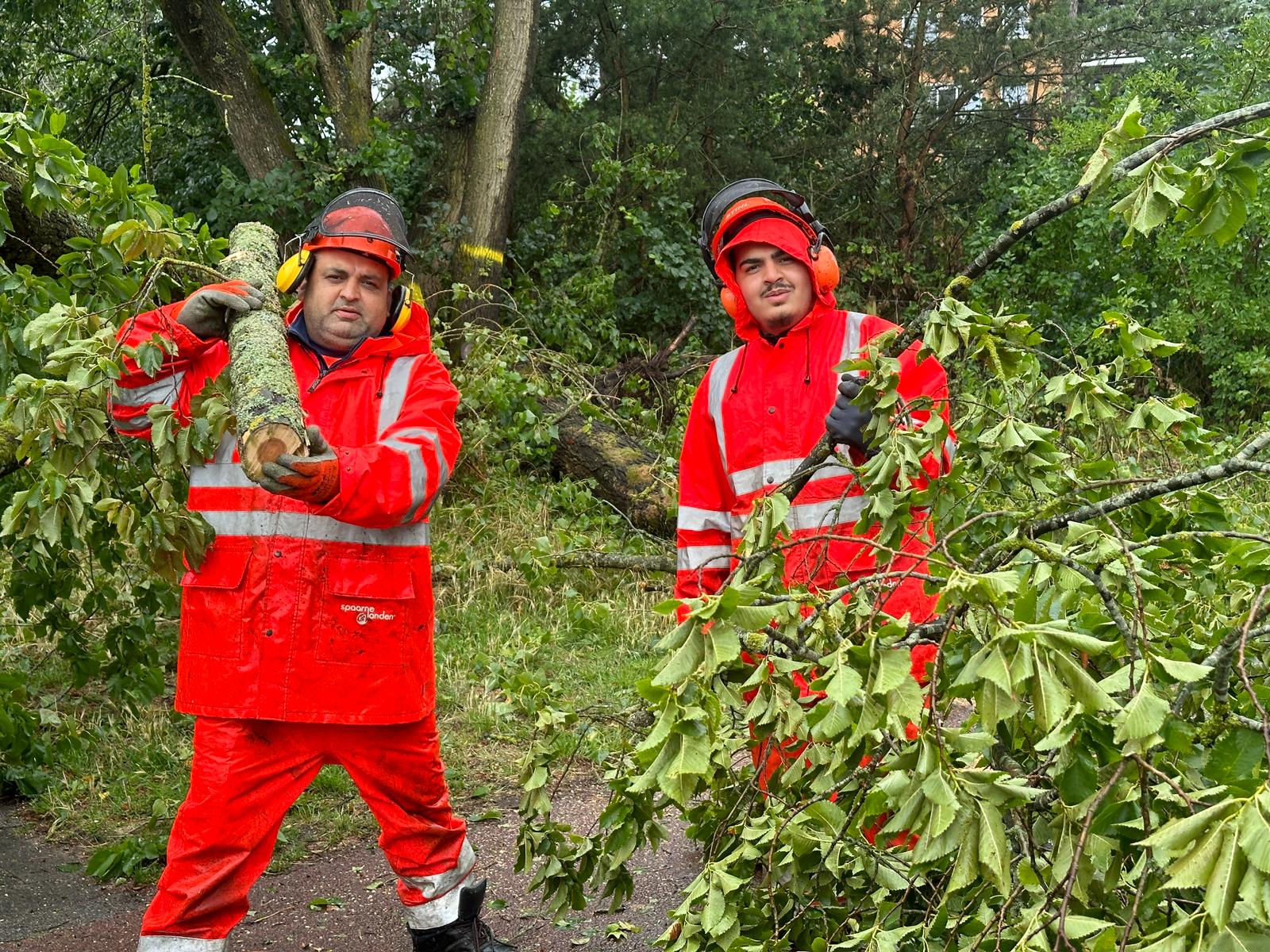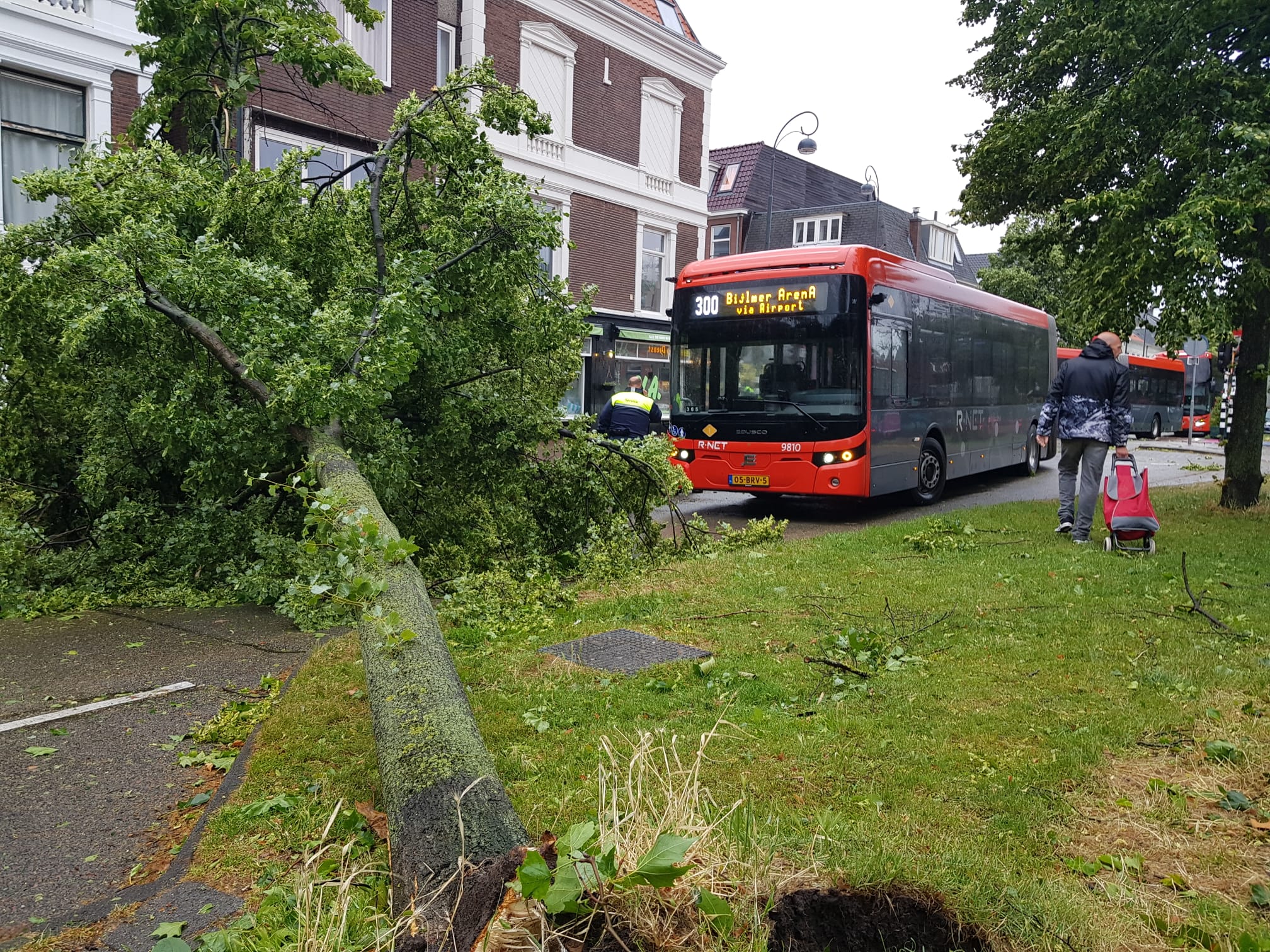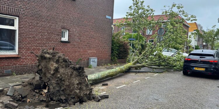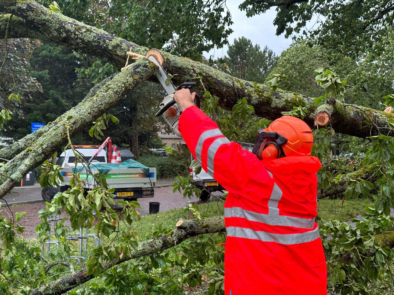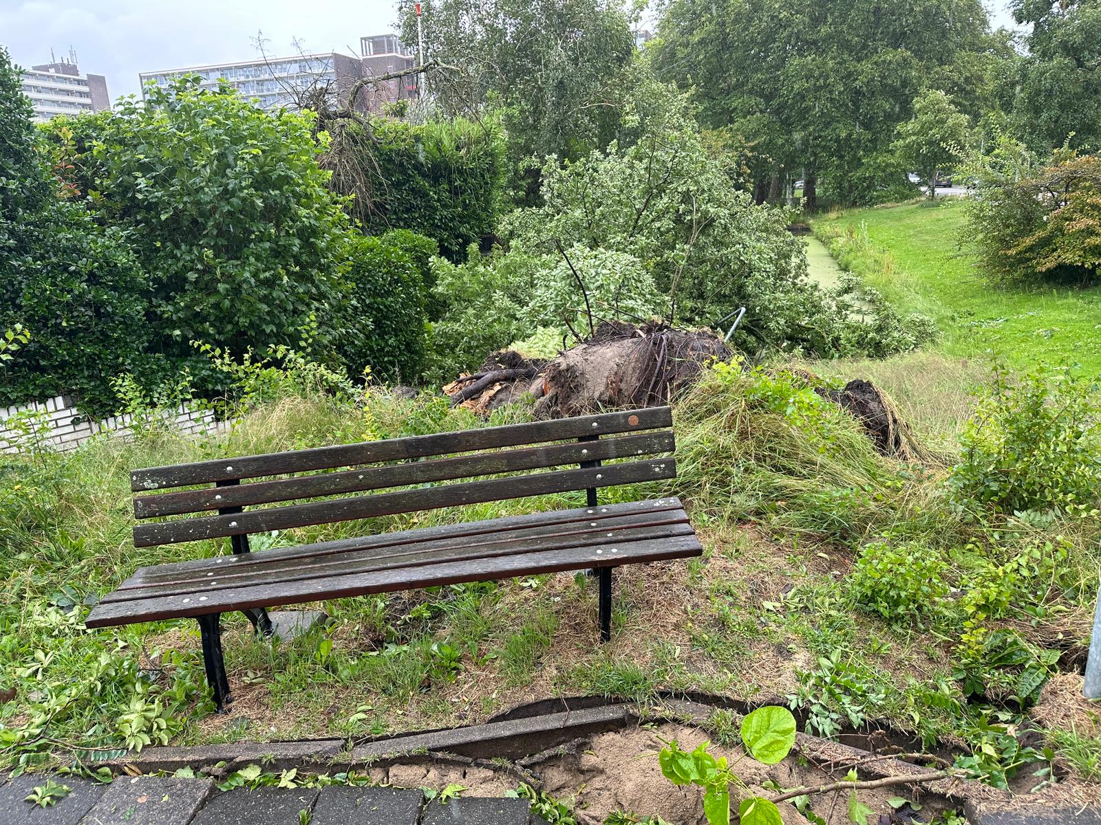 “Wij zagen veel mensen rondjes rijden in de straat en kwamen er pas later achter dat aan beide kanten van de straat een boom is omgevallen”, vertelt Timmer. Vlak nadat ze naar buiten gingen vielen ook andere bomen om in de straat. “Ik zag ze om knikken als saté prikkers zo op de huizen van de buren. Er zijn nu in totaal zes bomen om”, meldt Dieuwke.