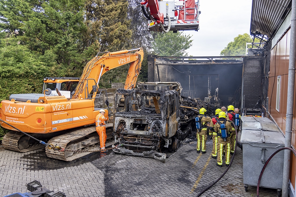 Een bergingsbedrijf heeft vandaag tegen het einde van de middag de uitgebrande vrachtwagen met oplegger uit de laad en los ruimte getrokken van de supermarkt. Een sloopbedrijf heeft even daarvoor een deel van het magazijn gesloopt vanwege instortingsgevaar, voordat de vrachtwagen uit het pand kon worden getrokken. Langzaam is de wagen na het slopen naar buiten gehaald.