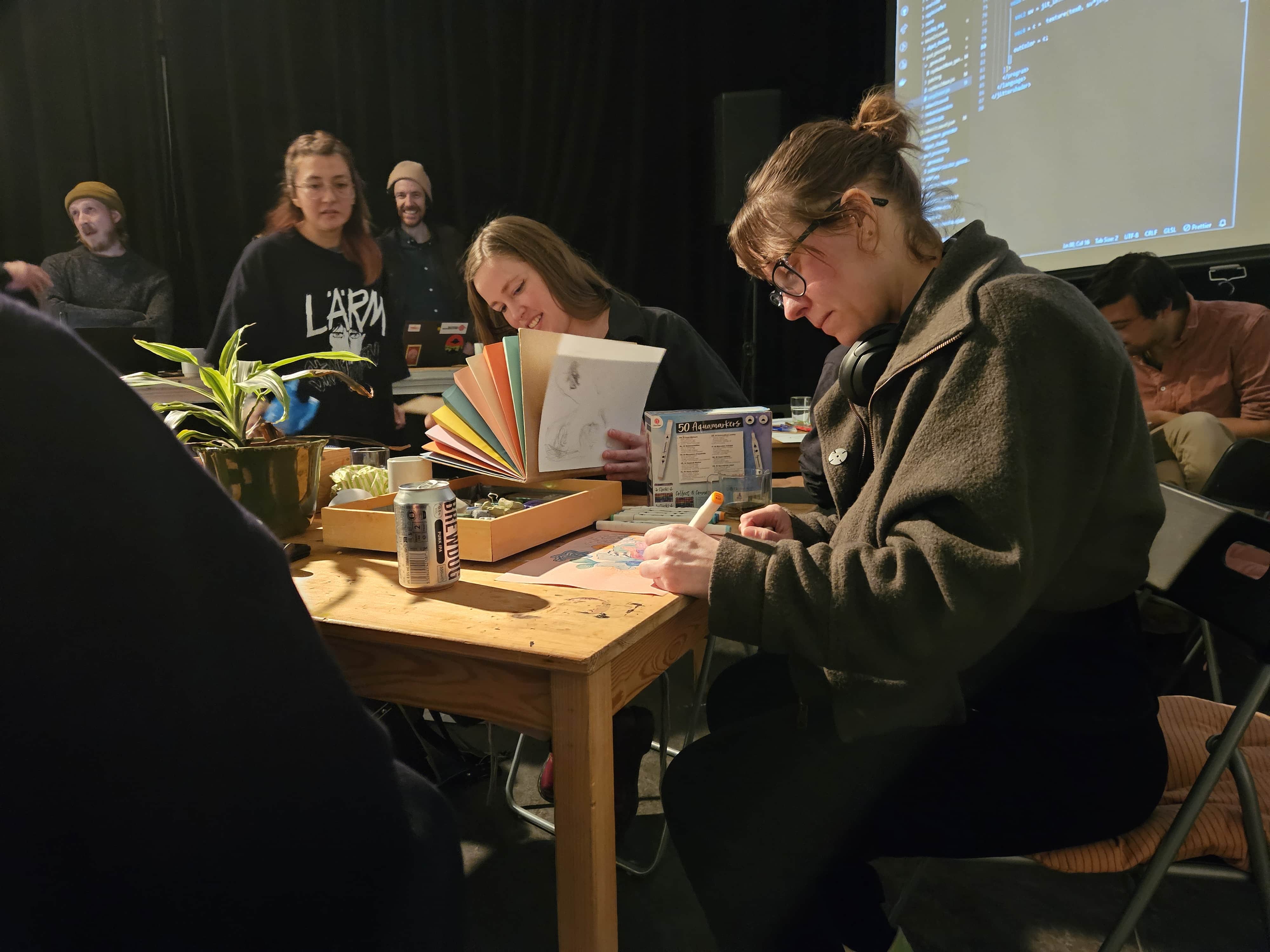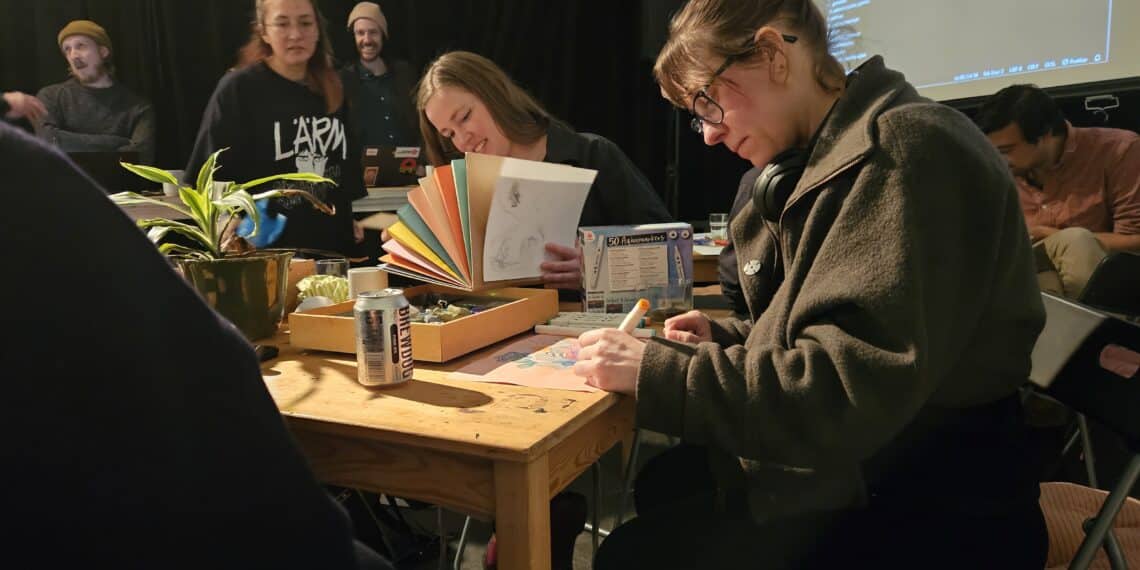 Een groep tekenliefhebbers was woensdag druk aan het werk tijdens de week van de Haarlemse Nacht. In Nieuwe Vide kwam de tweemaandelijkse tekenclub ‘Teken of leave it’ bijeen om mooie illustraties te maken, dit keer onder het genot van muziek van een dj en bijpassende beelden van een vj.