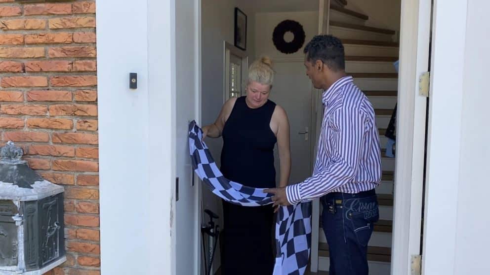 Ellen heeft geen vlaggenhouder en kijkt nieuwsgierig als Roy de vlag bevestigt aan haar raam. “Dit lijkt me absoluut een alternatief als je geen vlaggenstok kunt gebruiken voor je huis. Ik heb net even gekeken en als het hard waait, blijft hij echt wel zitten”, aldus Ellen.