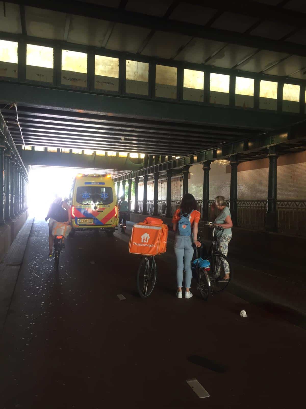 De vrouw stond even later met een bloedend hoofd wel weer op, maar een ambulance was al onderweg. Omstanders hebben haar ondersteund richting de ambulance en haar fiets werd aan de zijkant neergezet. Ooggetuigen meldden dat ze per ambulance naar het ziekenhuis is gebracht, waar mogelijk de wond is gehecht.