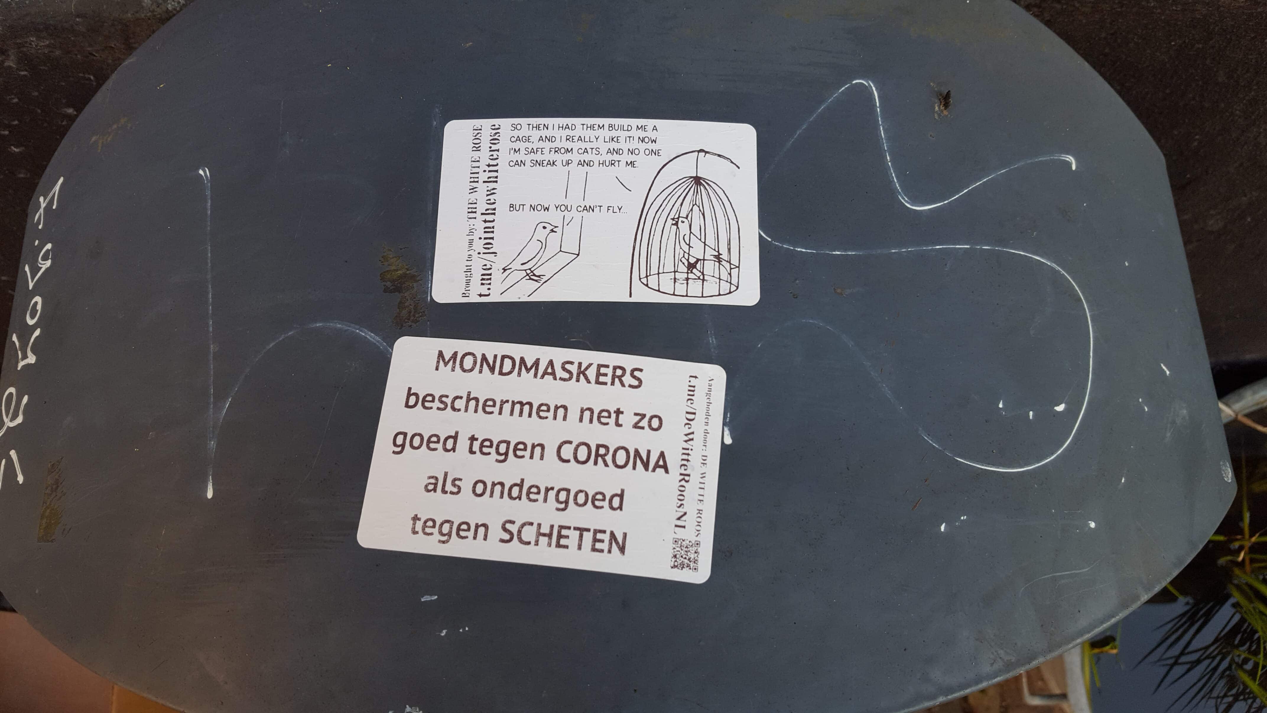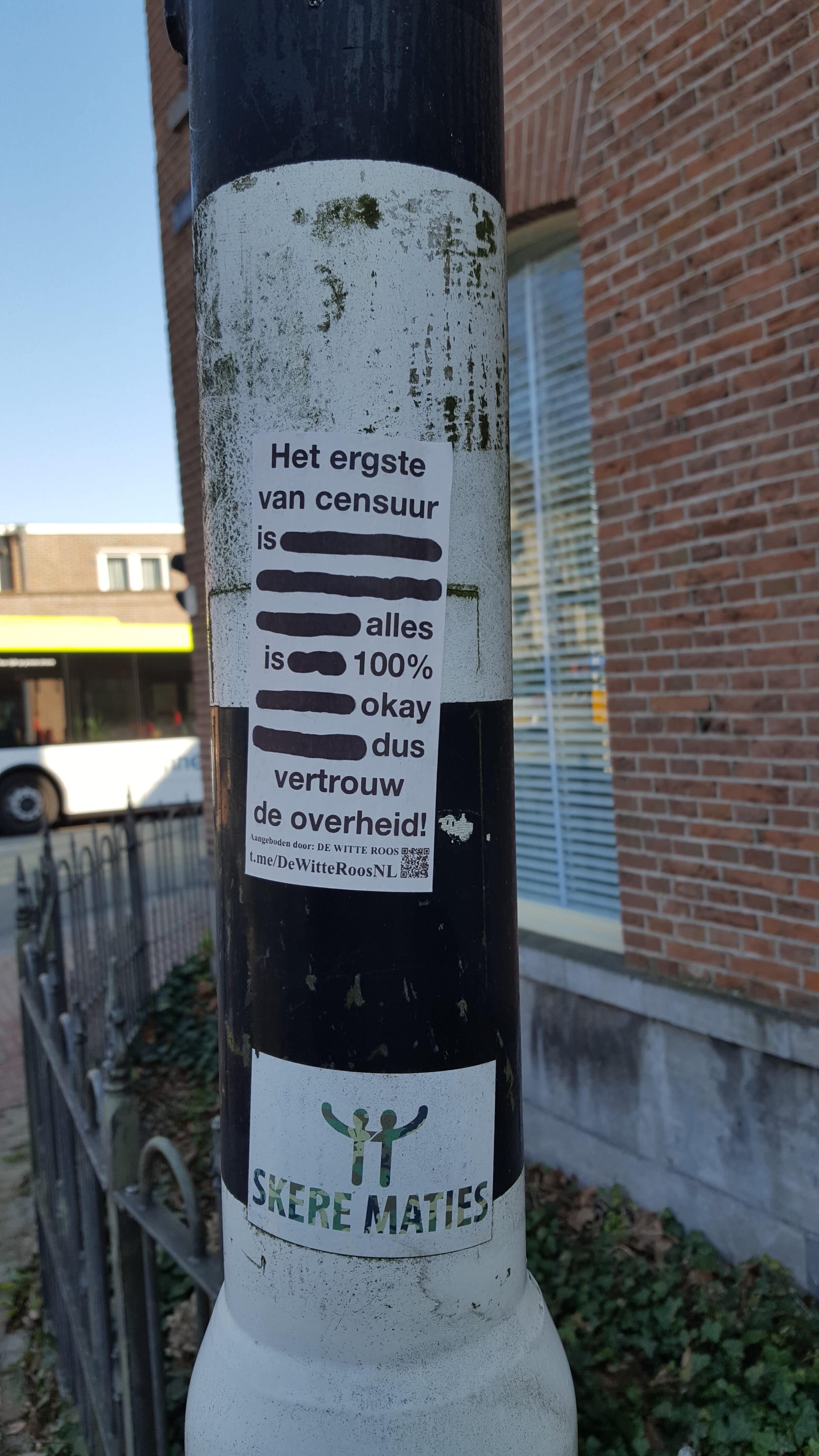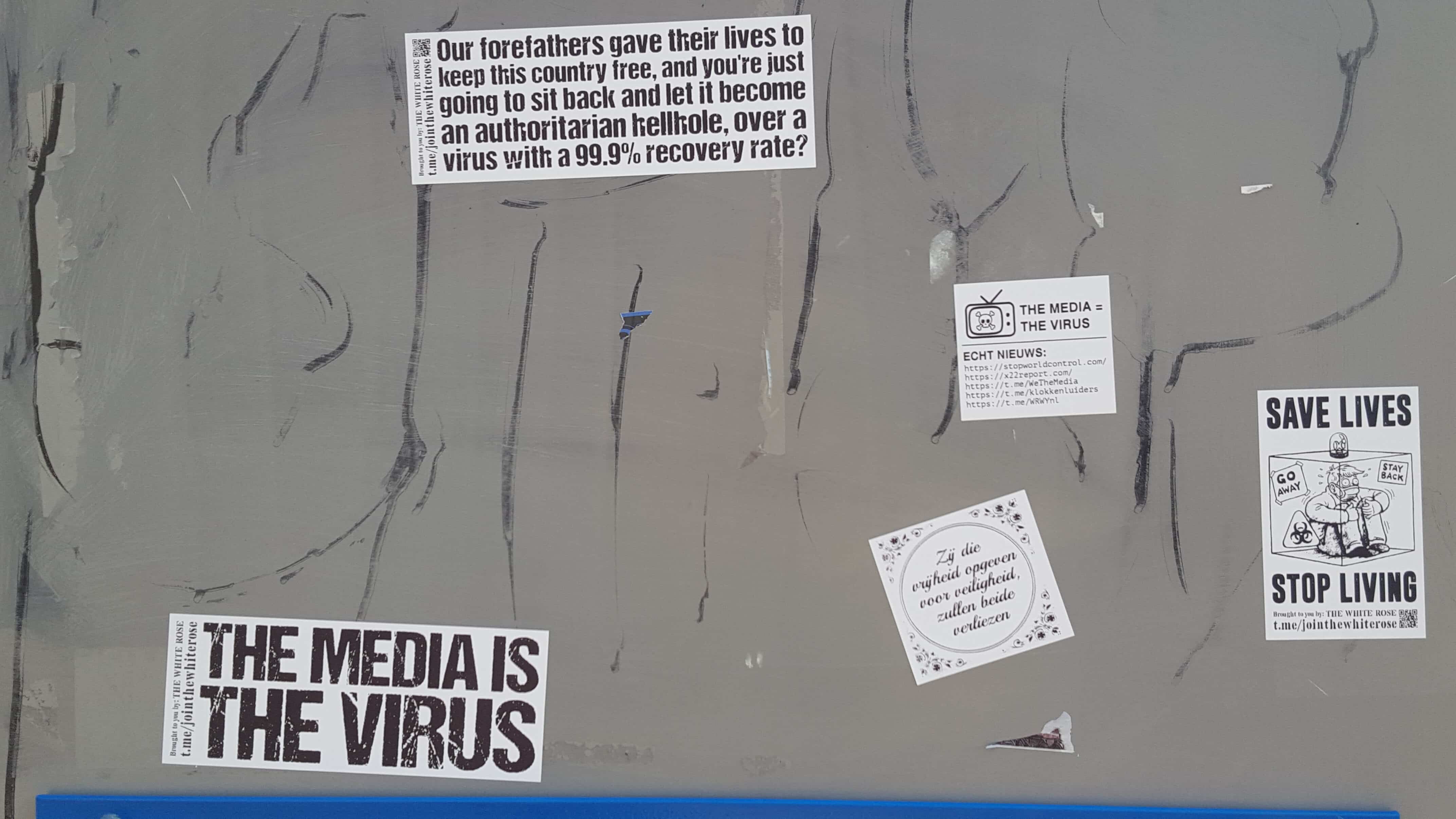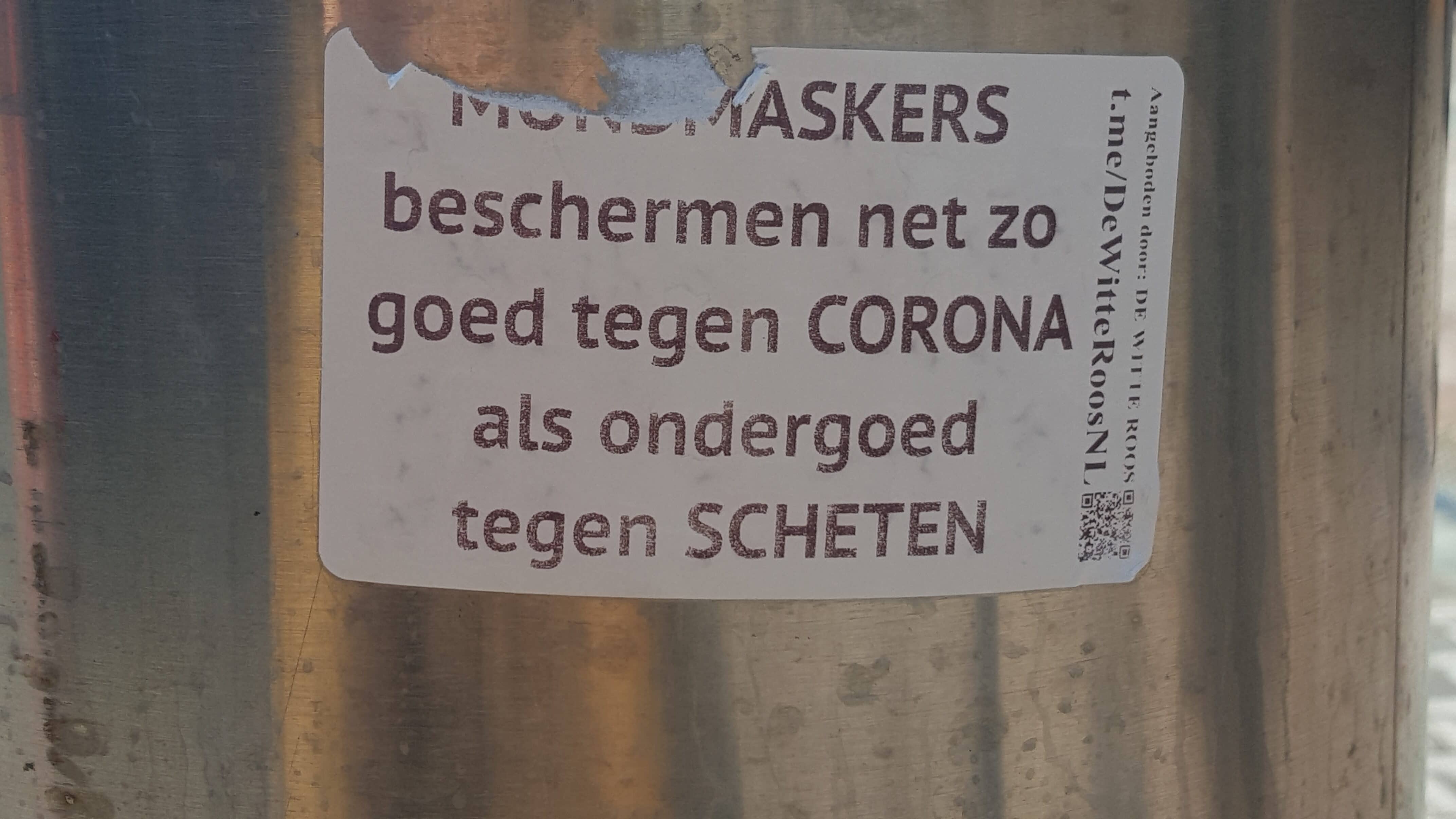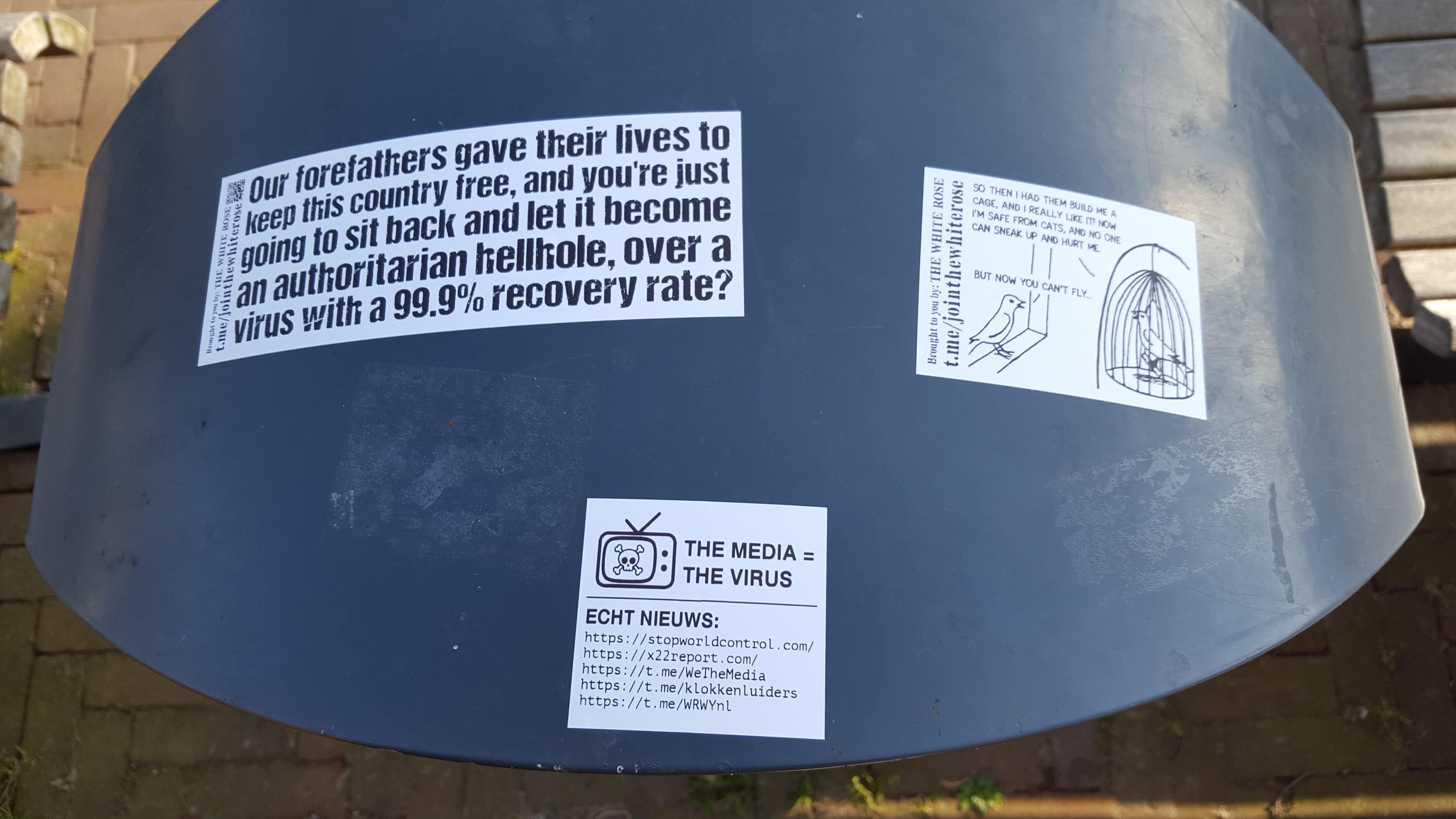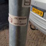 Een bijnaam hebben de anonieme plakkers wel. Intussen staan ze al een tijdje bekend als de coronawappies. De bijnaam die zij als snel in de media toebedeeld kregen. Soms wordt er verwezen naar websites met ‘het echte’ nieuws. Maar de boodschap is duidelijk. Vaccins zijn gevaarlijk, de mainstream media zoals kranten, journaals en de bekendere nieuwssites kleuren het nieuws rond het virus en verscheidene complottheorieën, de een nog onwaarschijnlijker dan de volgende, zijn niet van de lucht. Haarlem105 heeft de in het wild gespotte stickers gefotografeerd, verzameld en gerangschikt. De kiekjes, met daarop afwisselend Nederlandse en Engelse teksten en leuzen, zijn geschoten in onder andere de Coornhertstraat, Pieter Kiesstraat, de omgeving van het ns-station, Donkere Spaarne, Groot Heiligland en in de buurt van de Haarlemse Stadsschouwburg. Een greep uit de op zijn minst opmerkelijke collectie.