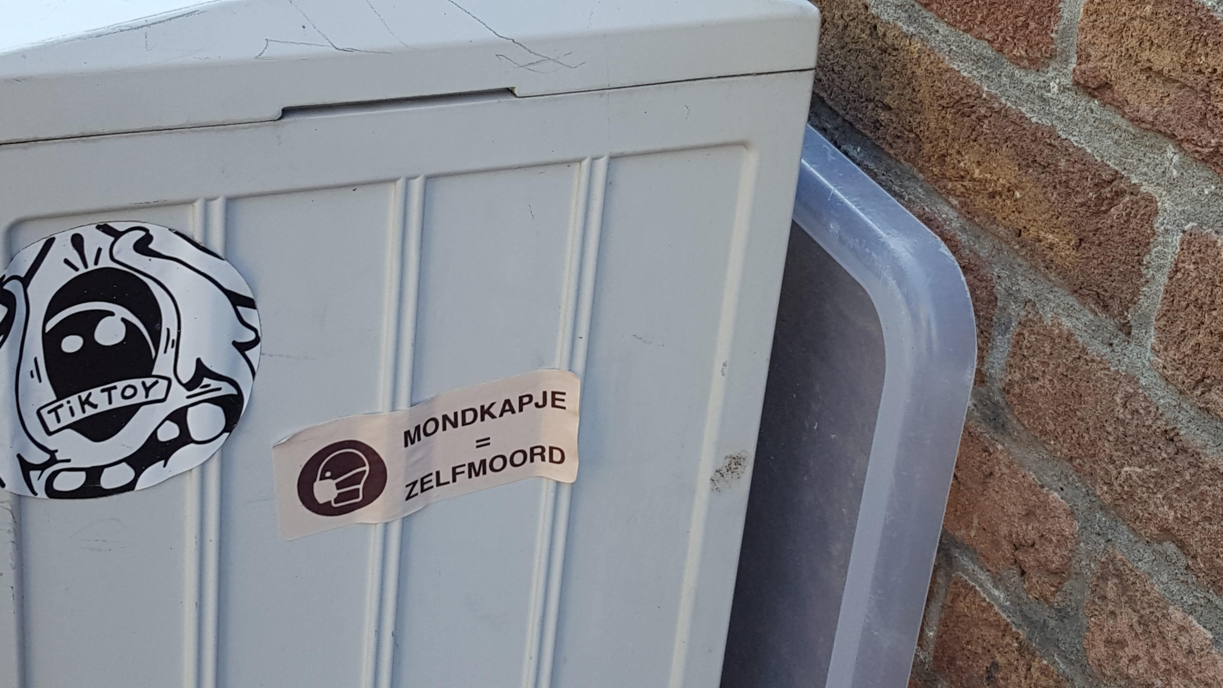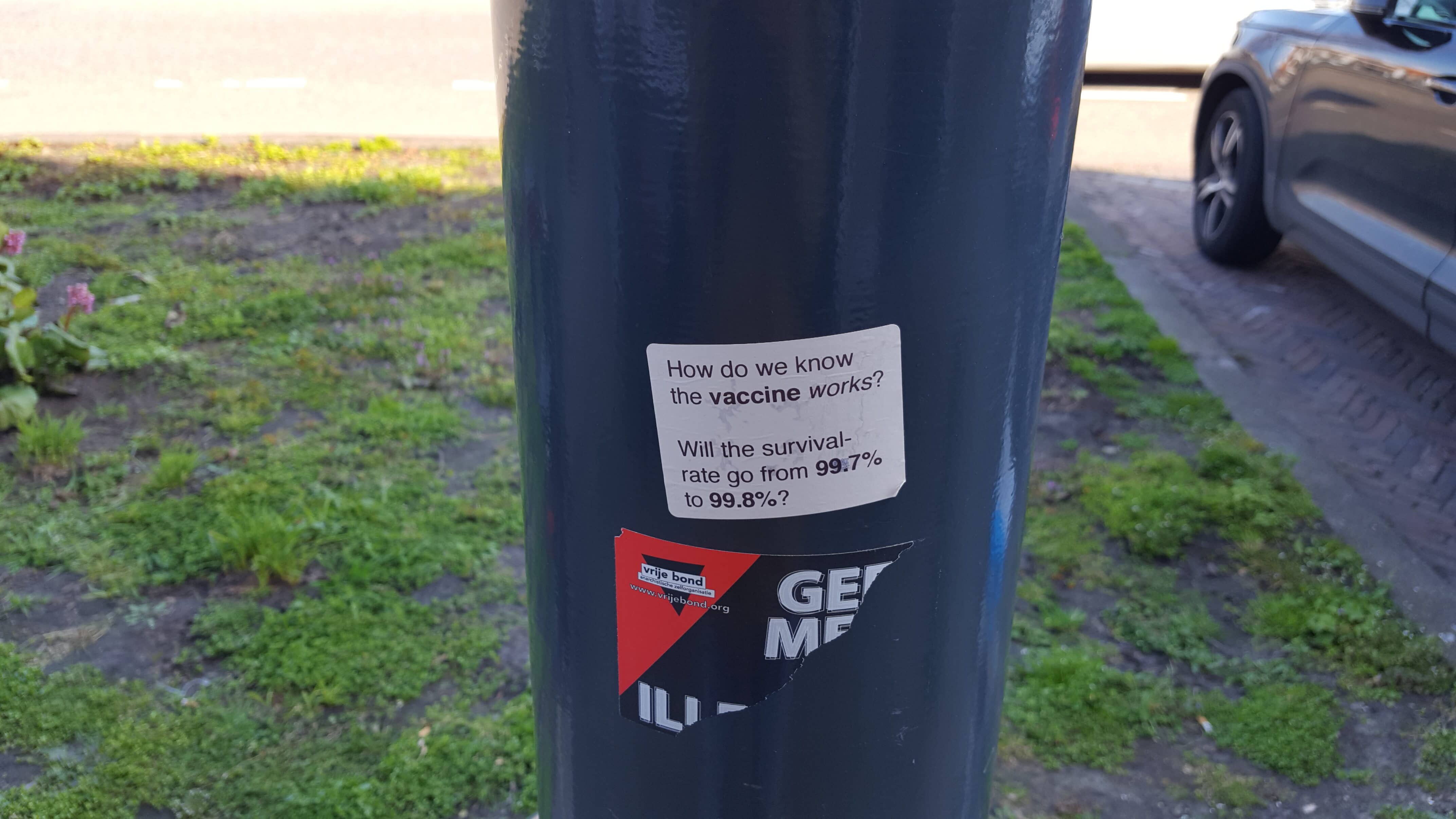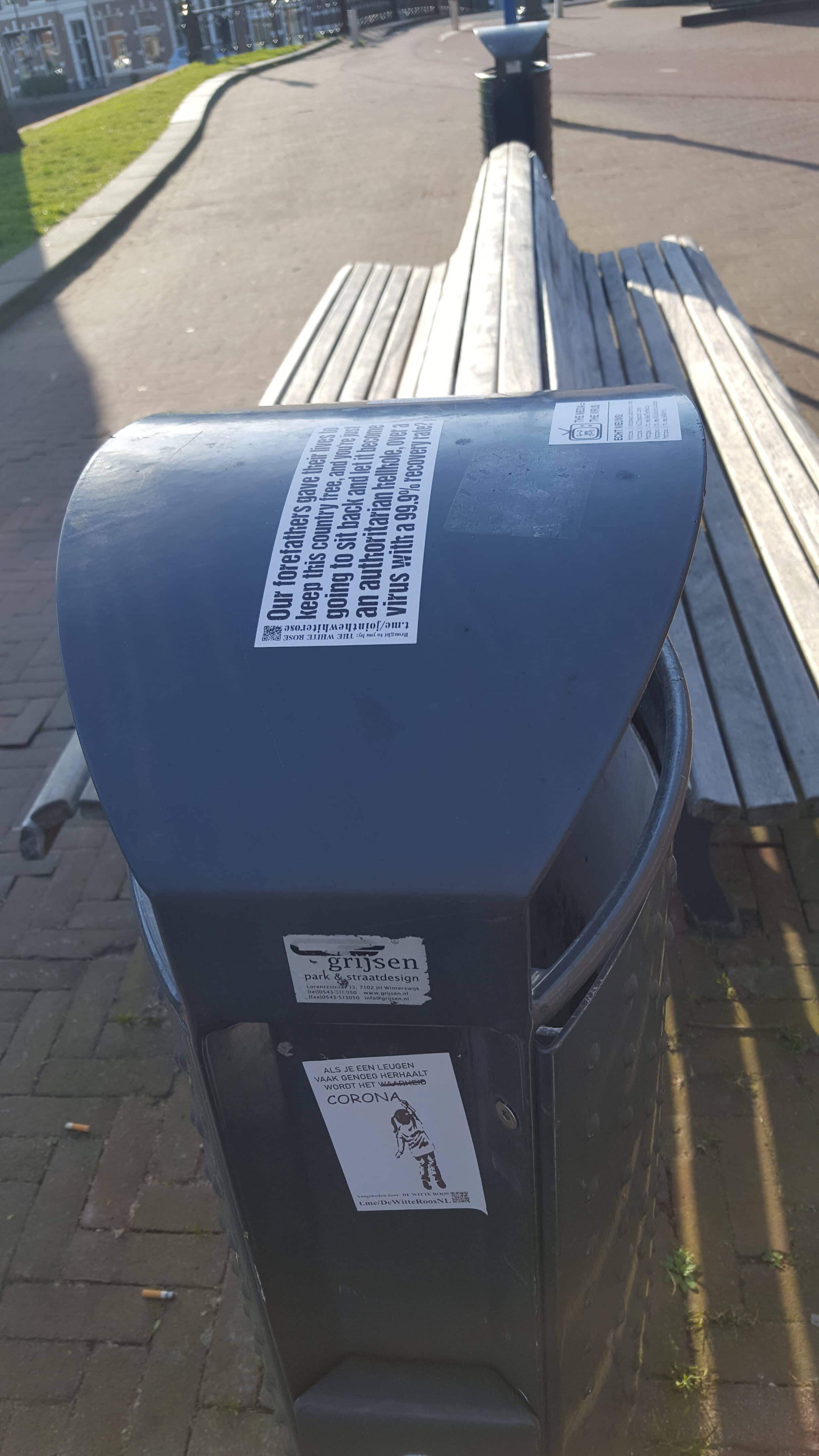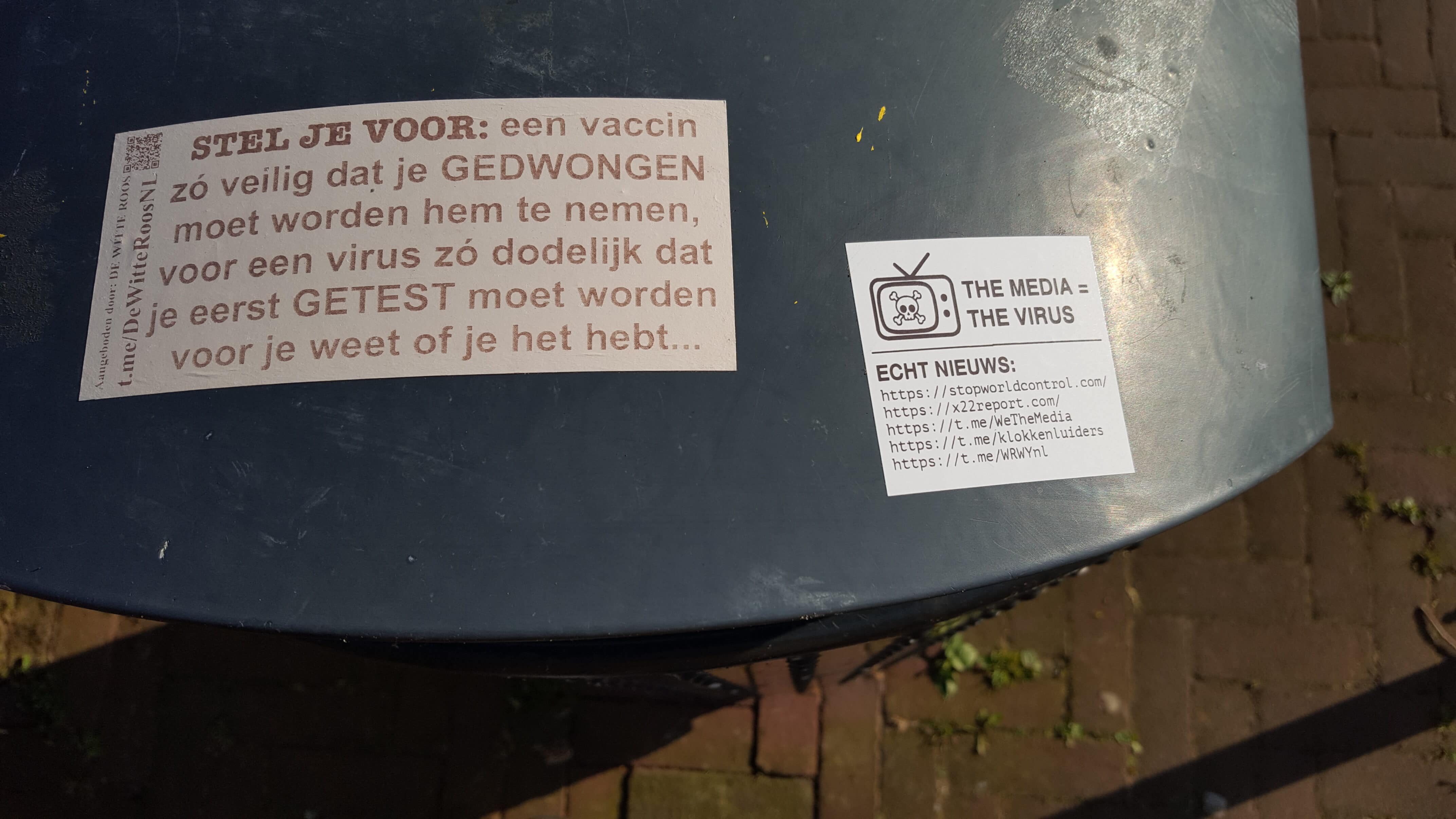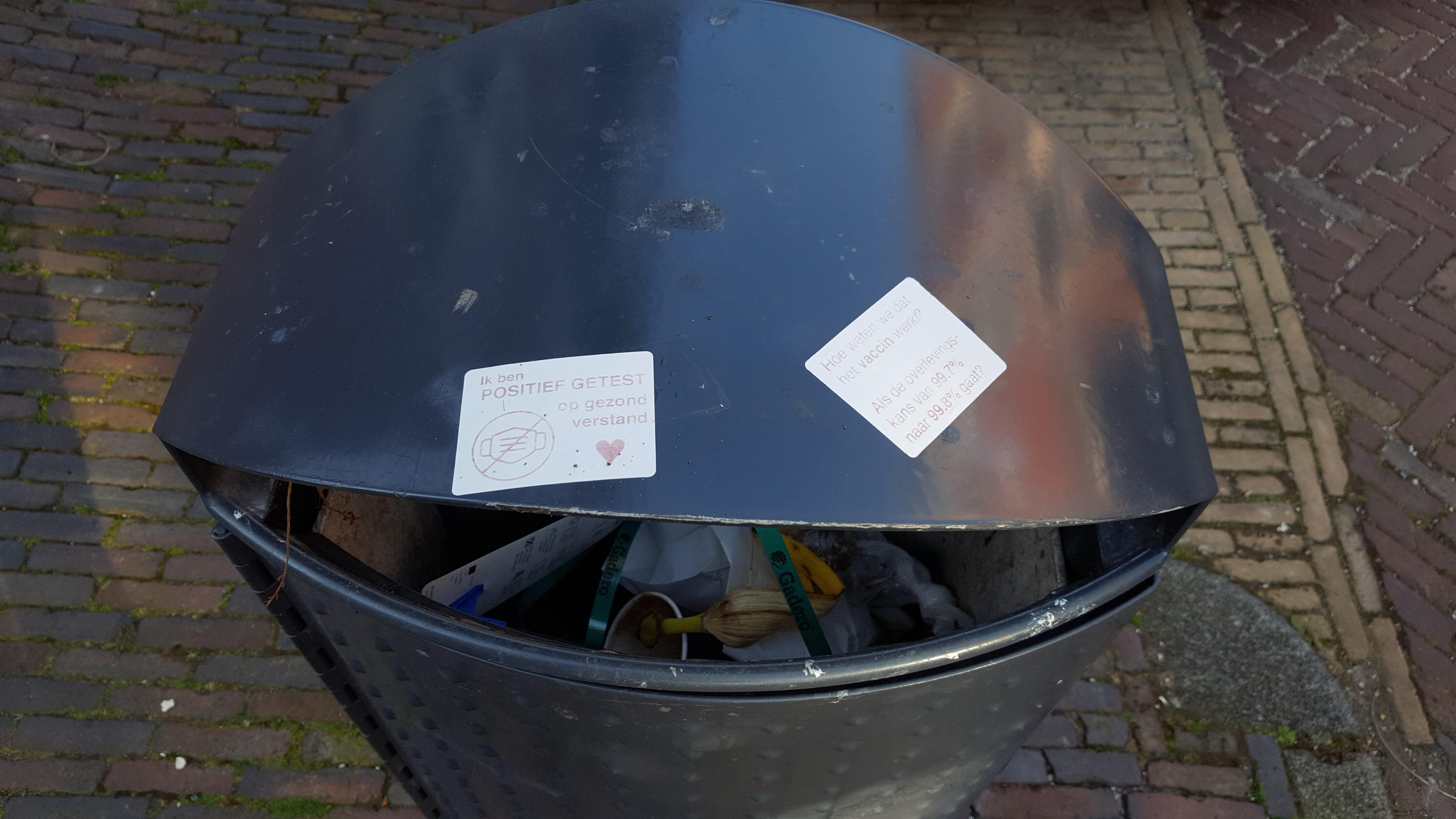 Dat lang niet iedereen staat te trappelen voor het halen van zijn coronaprik, is bekend. Ook in Haarlem verschijnen er op steeds meer plekken in de stad stickers, affiches en postertjes die dat bevestigen. Wie de anti-corona boodschappen, veel gespot op prullenbakken, containers en lantaarnpalen verspreiden, blijft meestal in het ongewisse.