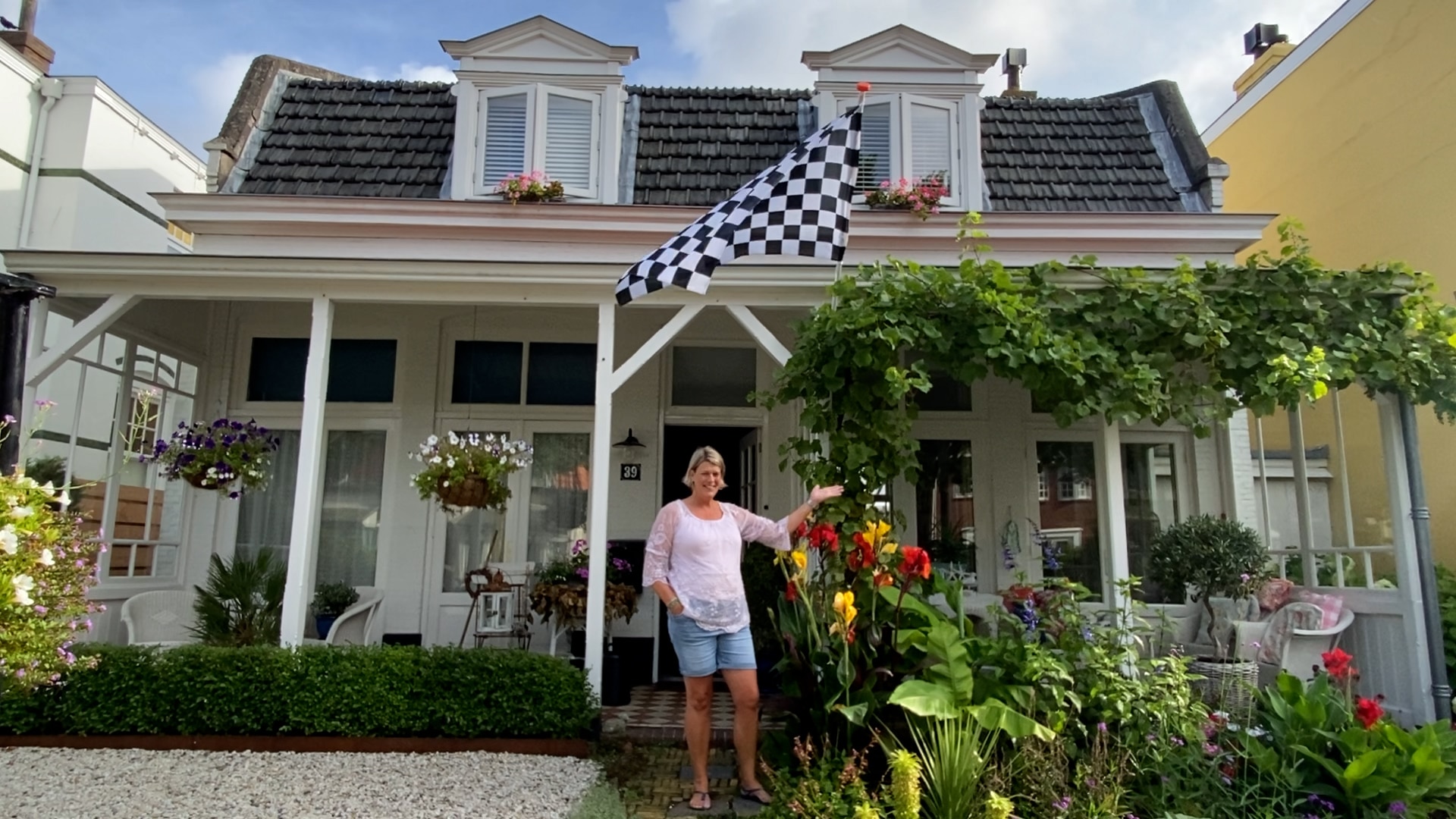 Janine Govers heeft de kenmerkende zwart-wit geblokte racevlag aan haar huis gehangen. “Ik ben geboren in Zandvoort en ik heb de vorige races meegemaakt. Ik was toen heel jong en dat was echt reuze spannend. Overal waar een auto kon staan, stond er een. En iedereen verkocht lekker drinken aan de kant van de weg. Dat was allemaal geen enkel probleem.”